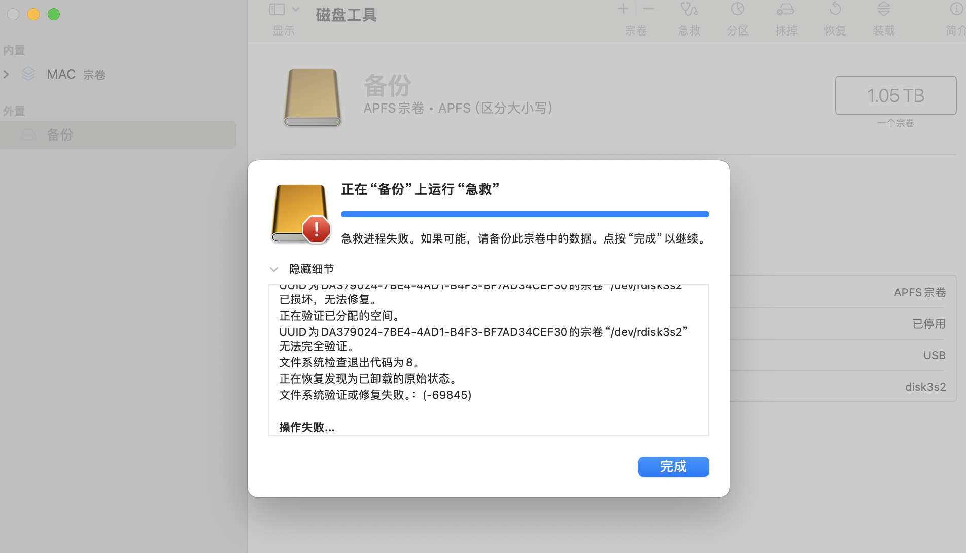 1、在【磁盘工具】点击“装载”无反应,点击“急救”提示急救失败;