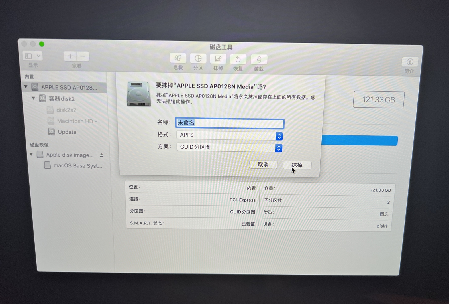 求助,19款13寸macbook pro,目前系统版本为14.6.1,想要降级到10.15.7。制作完系统盘后进入系统盘“macos实用工具”中的“磁盘工具”抹掉根盘发现点抹掉没有反应。重启后按shift+option+command+r进入联网恢复工具的“磁盘工具”抹掉根盘也没有反应。