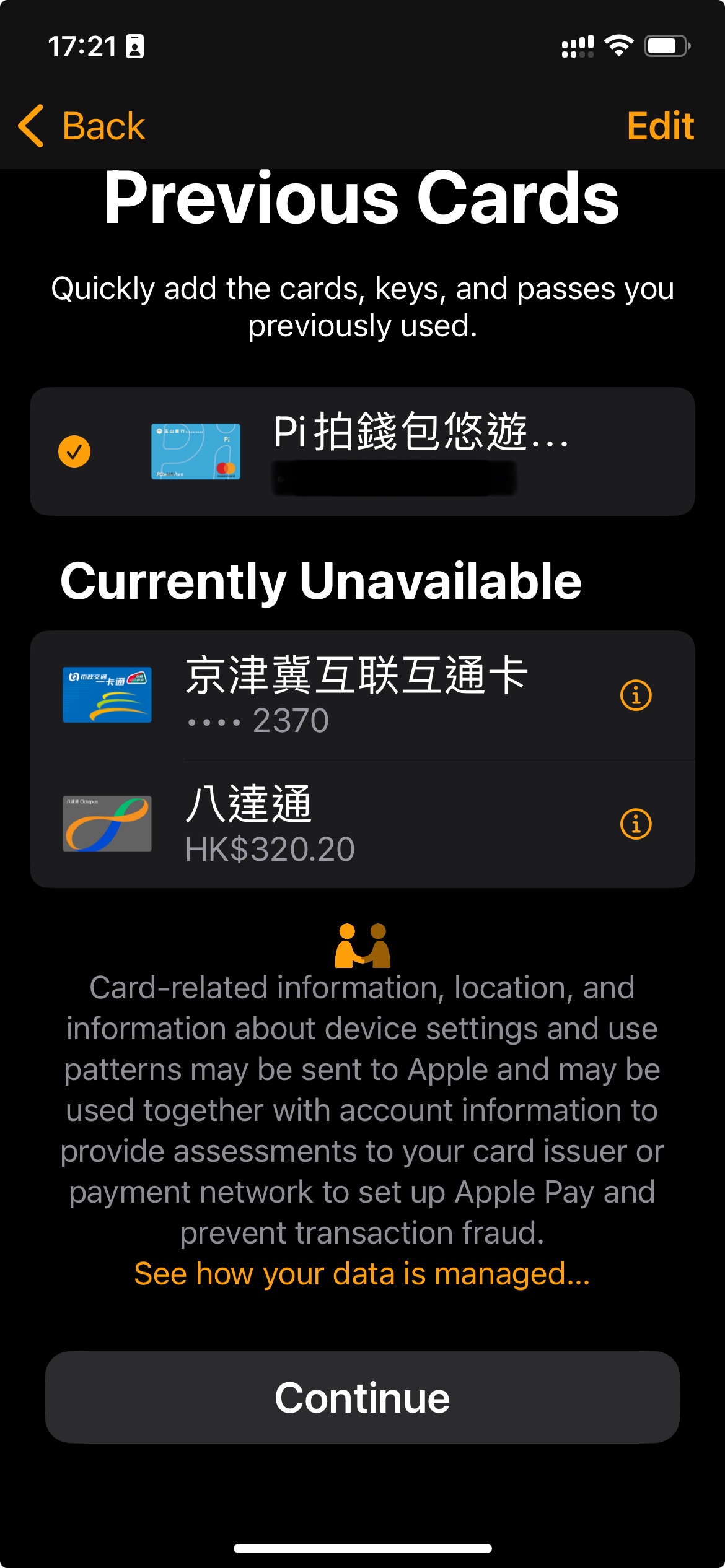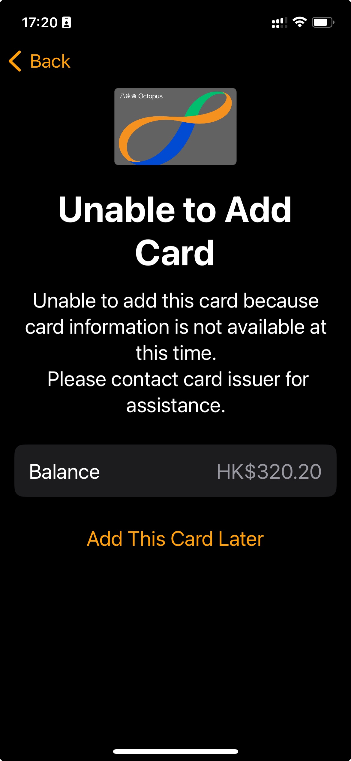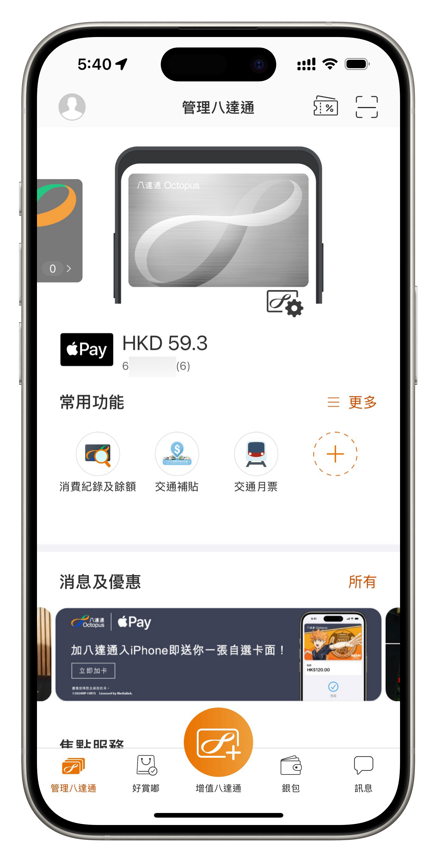 我能看到這張八達通以及餘額,但沒辦法加在我新的iPhone或Apple Watch上