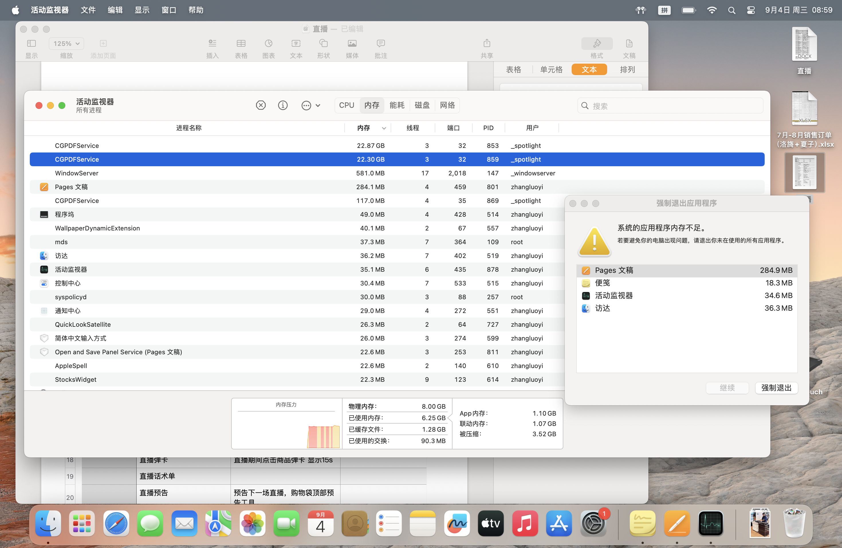 点开监视器发现CGPDF service有两个进程正在运行,分别占22个G,强制退出后内存再能正常运行,电脑内已经没有金山文档的软件存在,却依旧显示有该进程一直占用内存