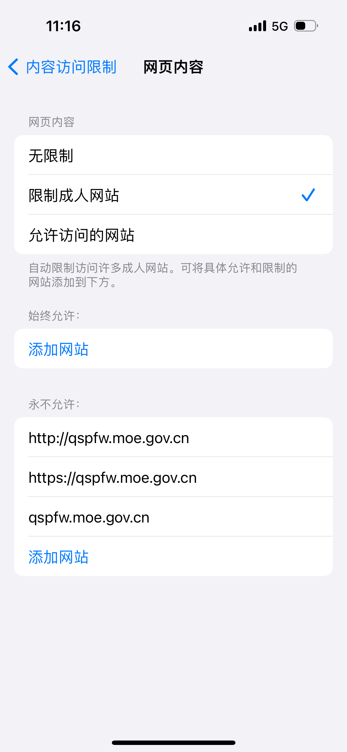 5.在“永不允许”下进入“添加网站”后输入禁止访问的网址