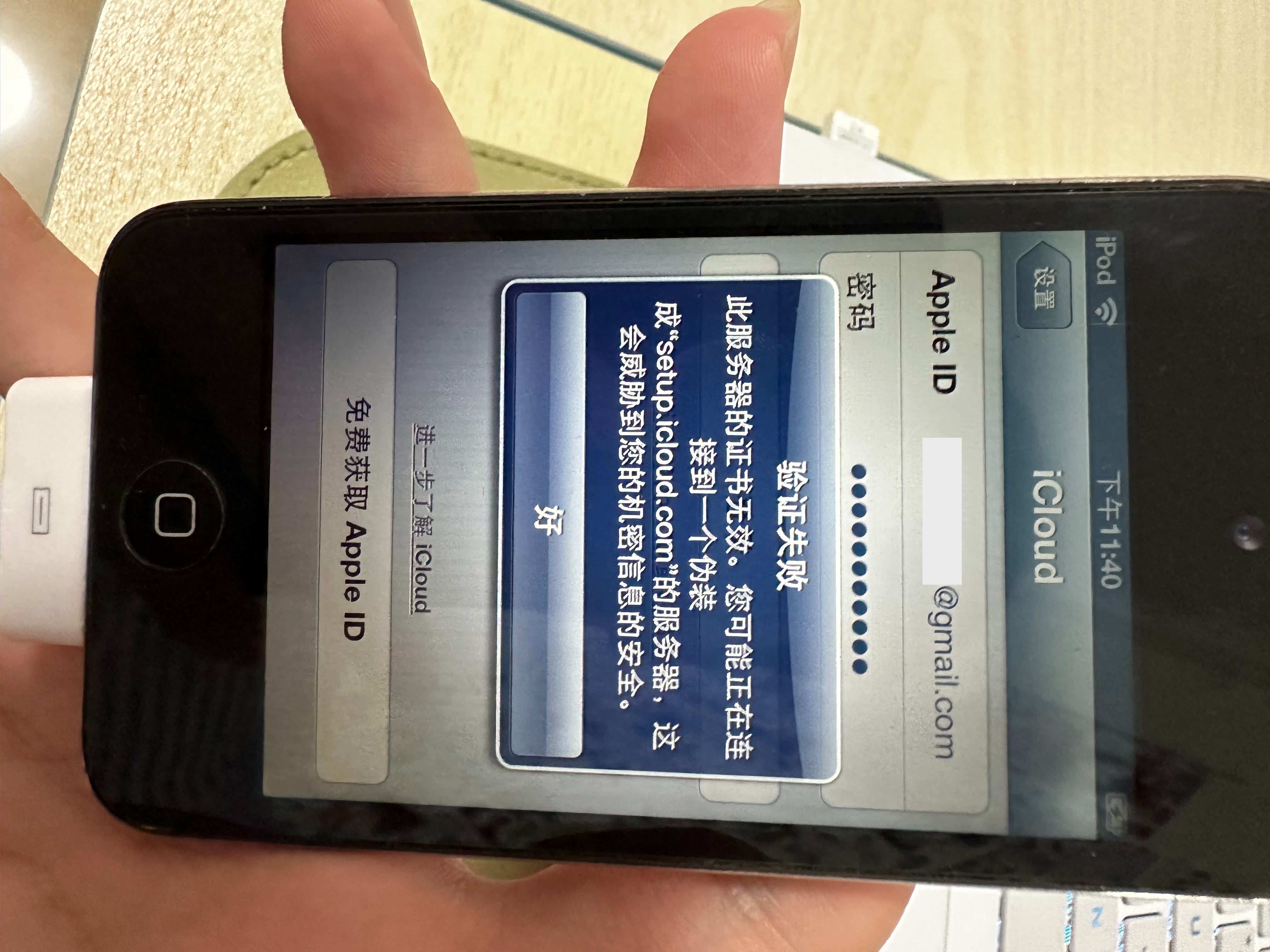 我的iPod touch 4代无法登陆iCloud,在输入正确的id与密码后验证失败,提示我正可能接到一个伪装成“setup.icloud.com”的服务器。显示为如此