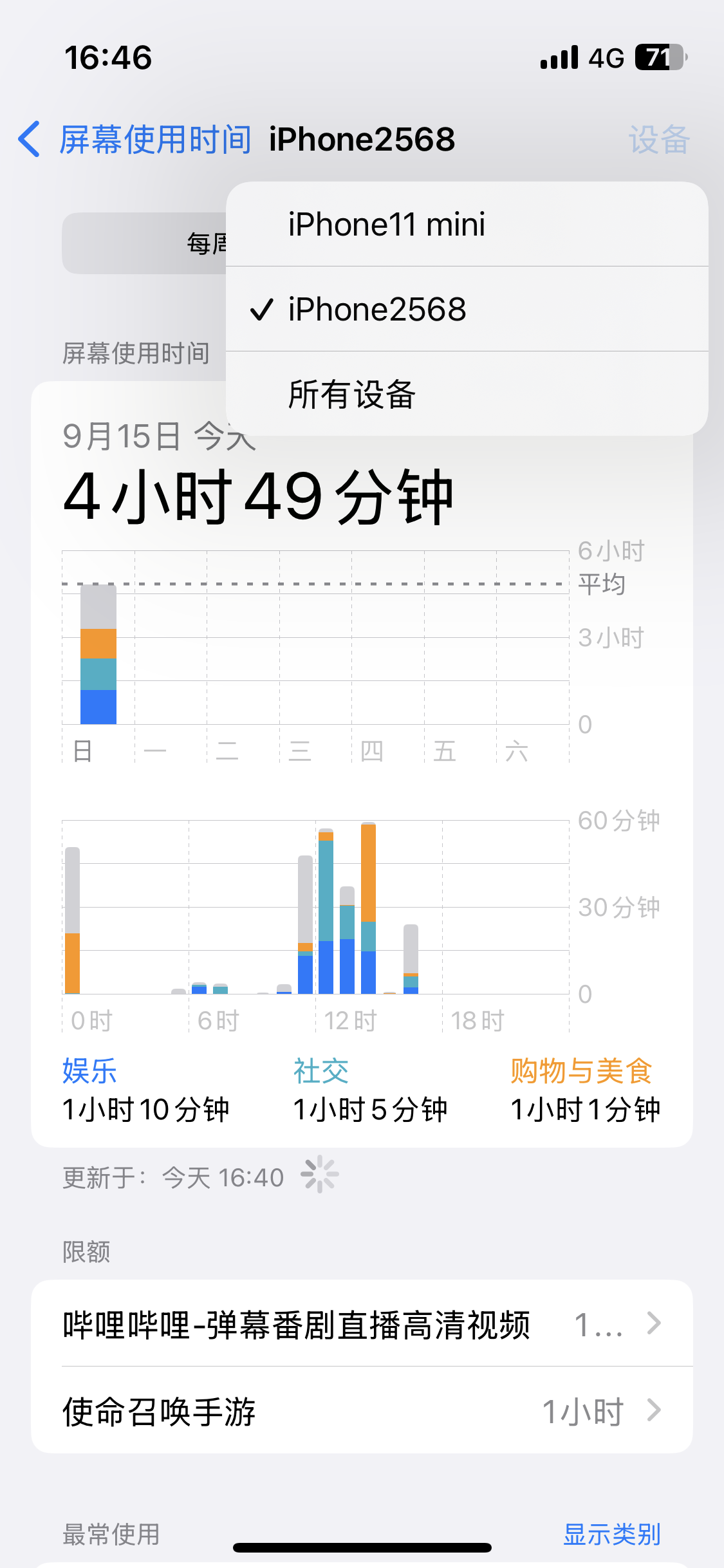 关闭app限额后还是存在限额,并且我只有一个设备屏幕使用时间却显示2个,关闭共享信息后本设备屏幕使用时间不可见