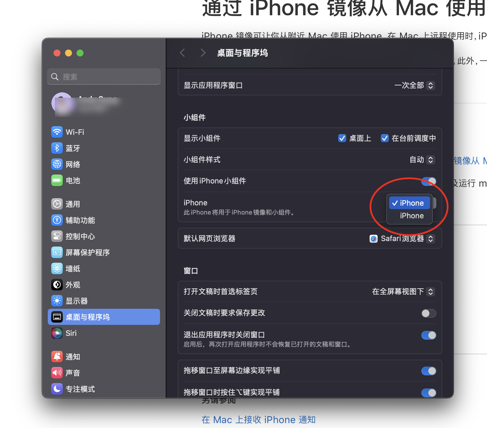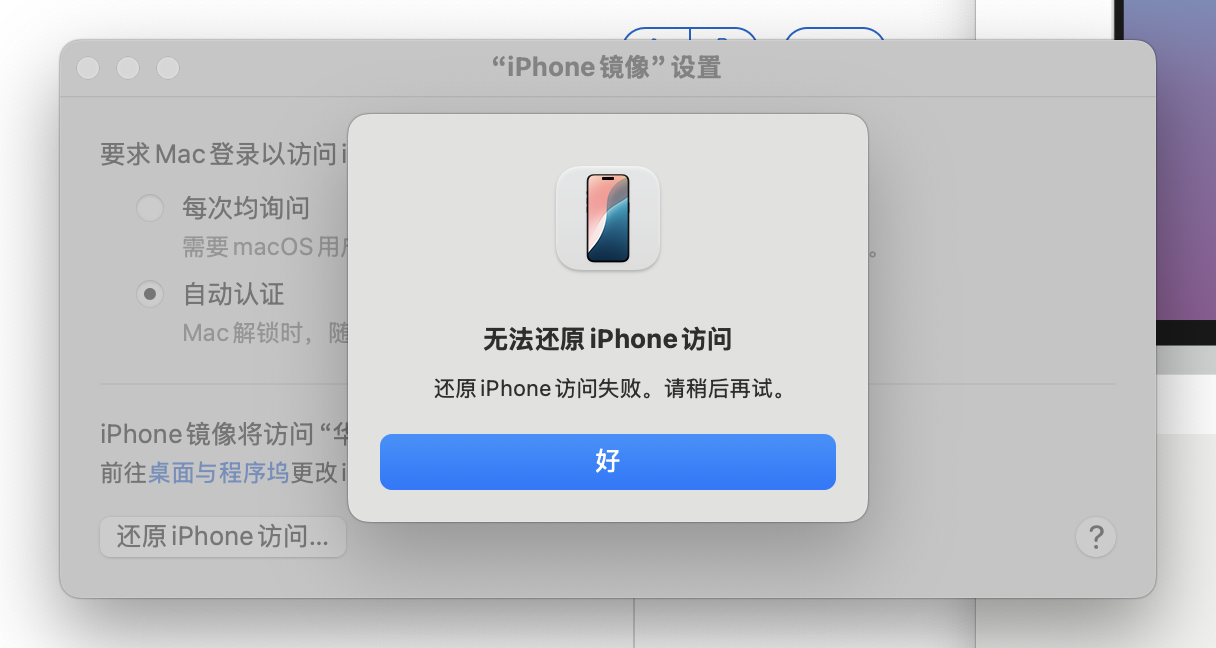 我在“设置”-“桌面与程序坞”修改设置后无法生效,每次重新打开“iPhone 镜像”程序的时候,又会回到原本的手机。此时再次打开“桌面与程序坞”,也会变成原本的手机。