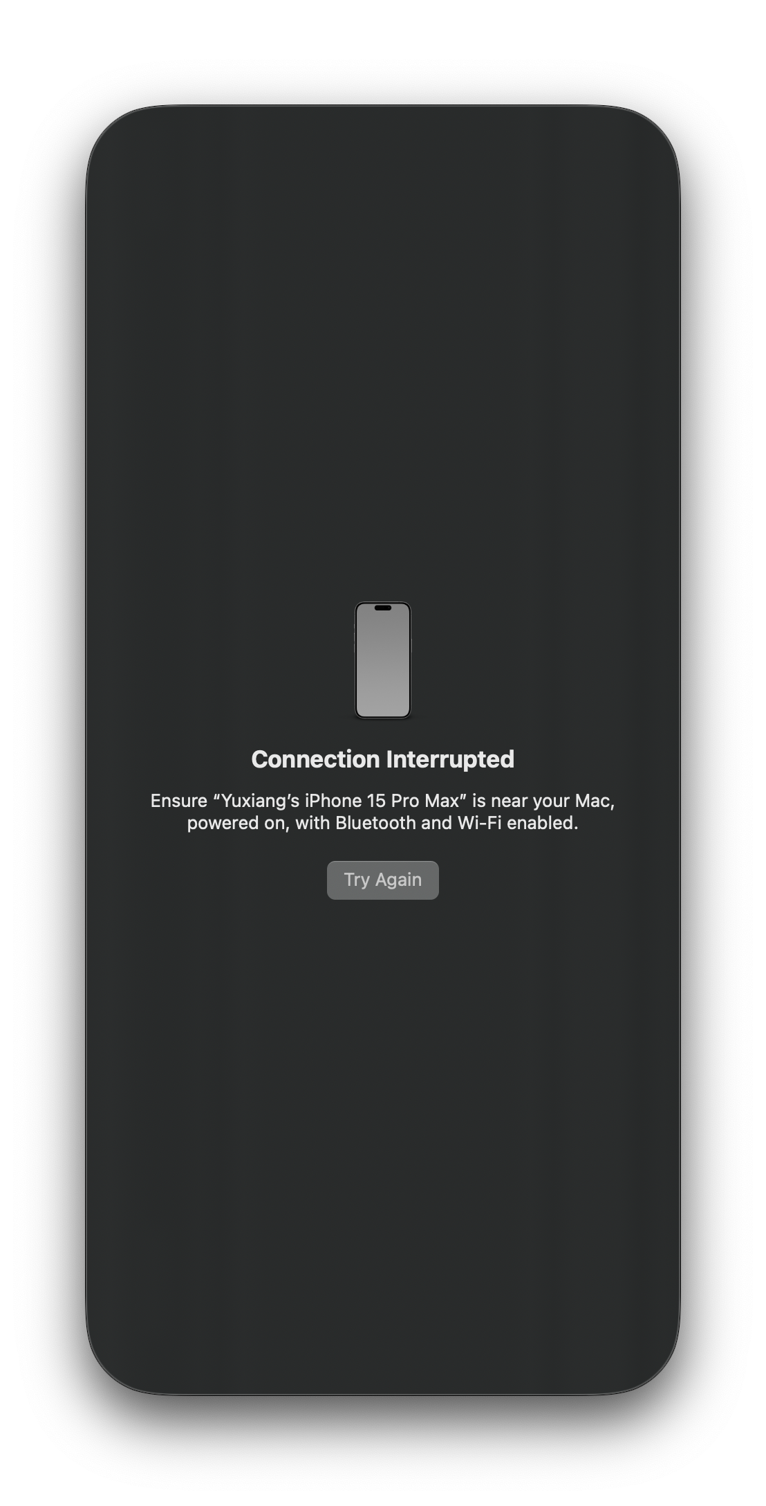 MacOS版本15;iOS版本18。打开iPhone镜像,手机提示输入锁屏密码,输入后,却提示“无法连接iPhone”。点击重试,又会让输入手机锁屏密码,输入完依然会提醒“无法连接iPhone”。
