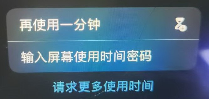 1.正常情况:限额时间达到后,会出现下图,提示点击“请求更多使用时间”后需要“输入屏幕使用时间密码”。如没有密码,将不能继续使用。