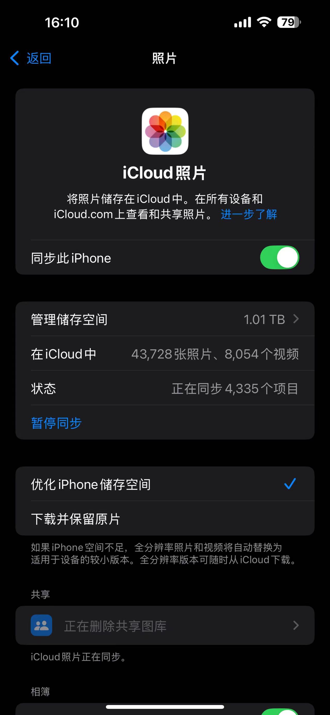 一直到今天,9月24日,icloud网页端上照片都正常,但是卡在了9月7日,icloud无法上传也无法下载,状态是正在同步4335个项目,这个项目的数量正好等于我的共享图库的项目数量。已经半个月过去了,毫无变化。