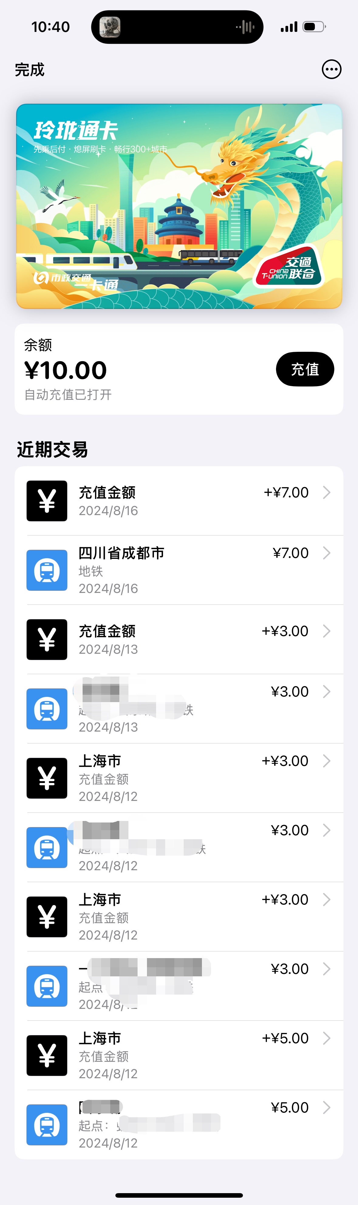 在这里强烈安利一下 Apple Pay 的京津冀互联互通卡的“玲珑通卡”,他需要用北京交通卡 App 来开通,然后绑定一个自动付款方式,最后的结果就是:它始终保持 10 元的余额,用多少,它自动充多少。
