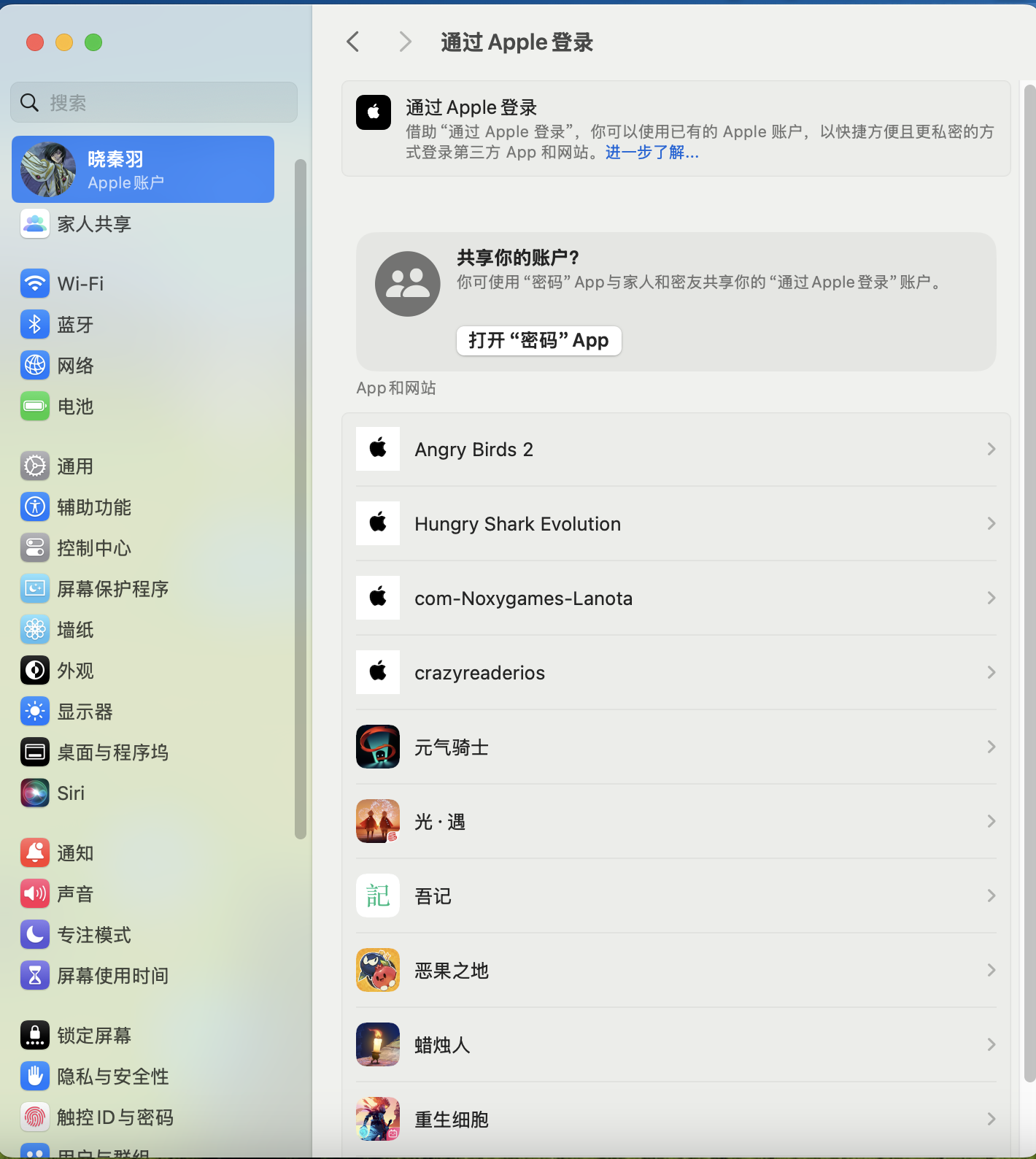 之后在最上面自己的“Apple账户”里找到“通过Apple登陆”,将里面不属于自己账户的app删除即可.