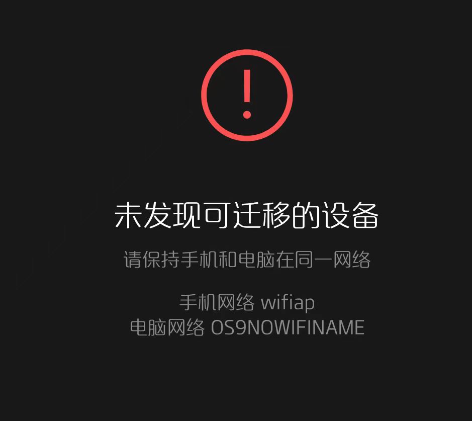 4.恢复过程中,需要连接同一个局域网。连Wi-Fi操作时,手机提示“电脑和手机没有连同一个网络,手机显示的网络名是Wi-Fi名,电脑显示的网络是OS9NOWIFINAME。”