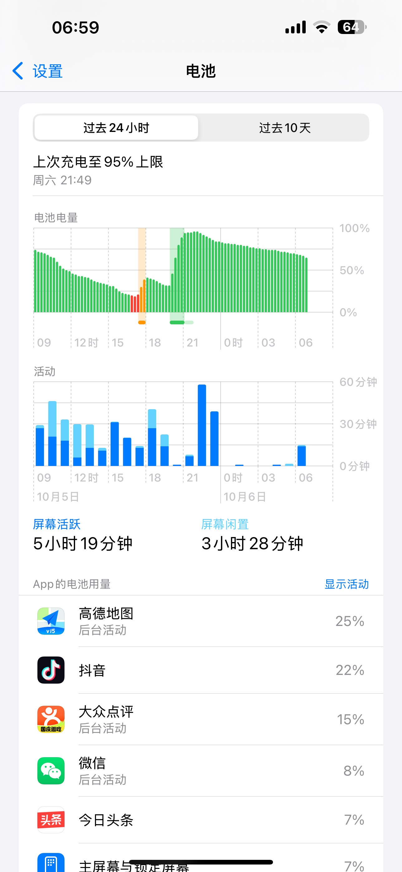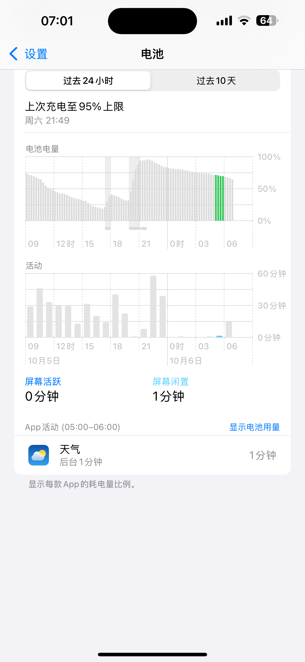 这时候手机电量竟然显示为98%,此后0点静置手机直至次日6点(此期间无任何操作),手机电量仅剩68%。掉电速度太快了。
