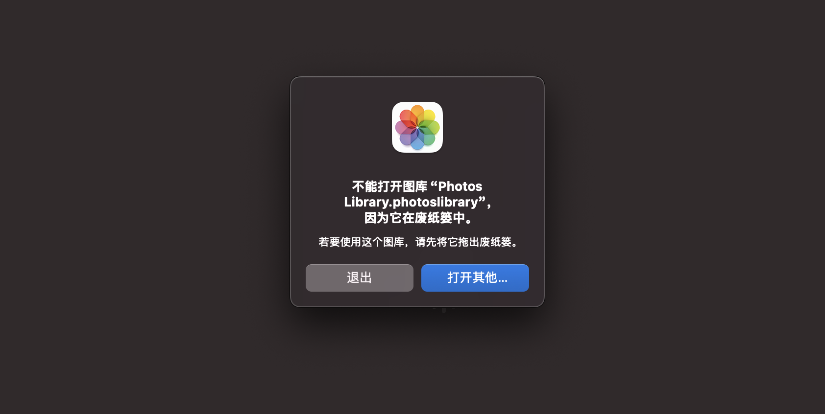 造成这个问题,估计的情景是,把自己Photos默认的图库删除熬了废纸篓里了,而且还倾倒了,才会造成现在的情况