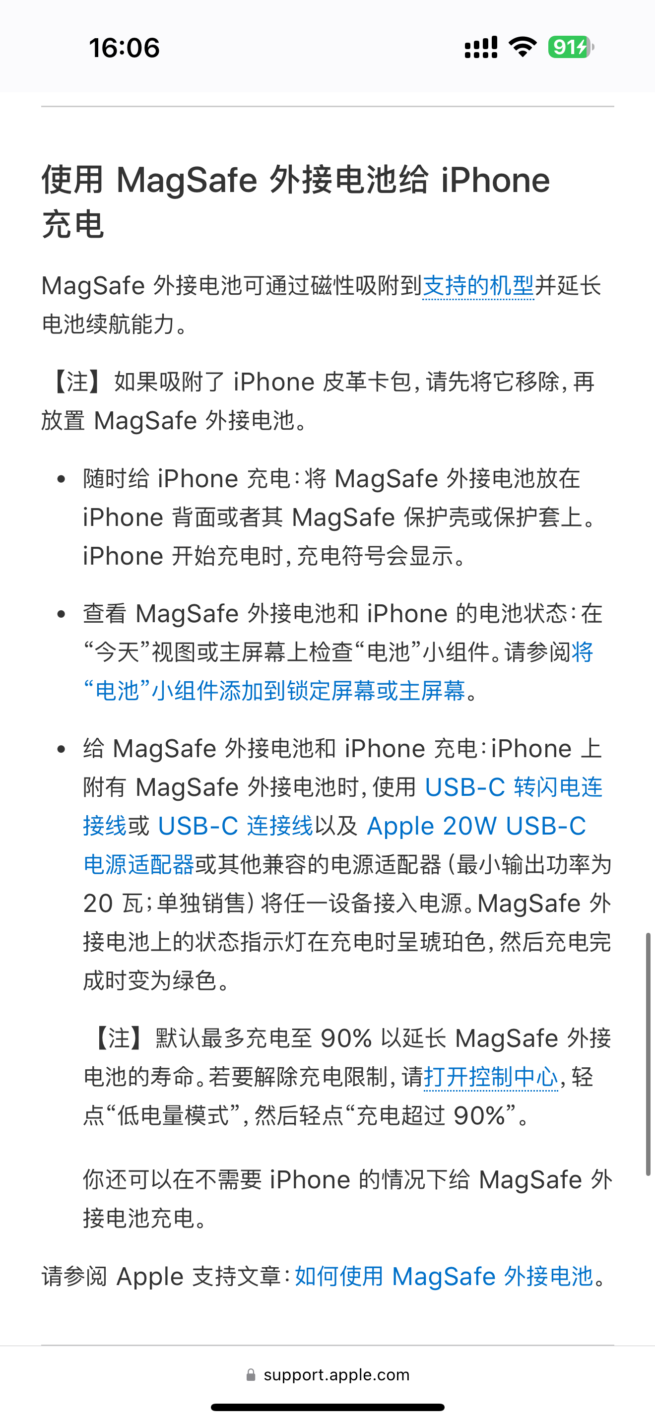 当iPhone电量充足,吸上外接电池并将充电线连接至16pro的c口时,外接电池不会进行充电,最终结果是手机一直满电 外接电池电量耗尽(除非换闪电接口的线直接插上外接电池给其供电)