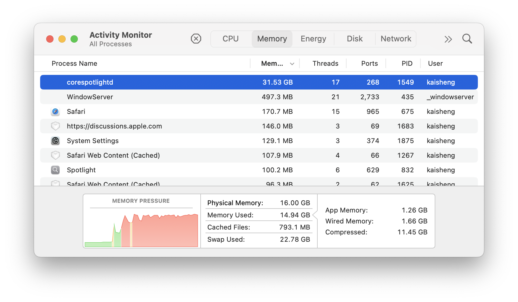 M3 MacBook Air,系统版本是macOS Sequoia 15.0.1,Corespotlightd占用大量CPU和内存资源