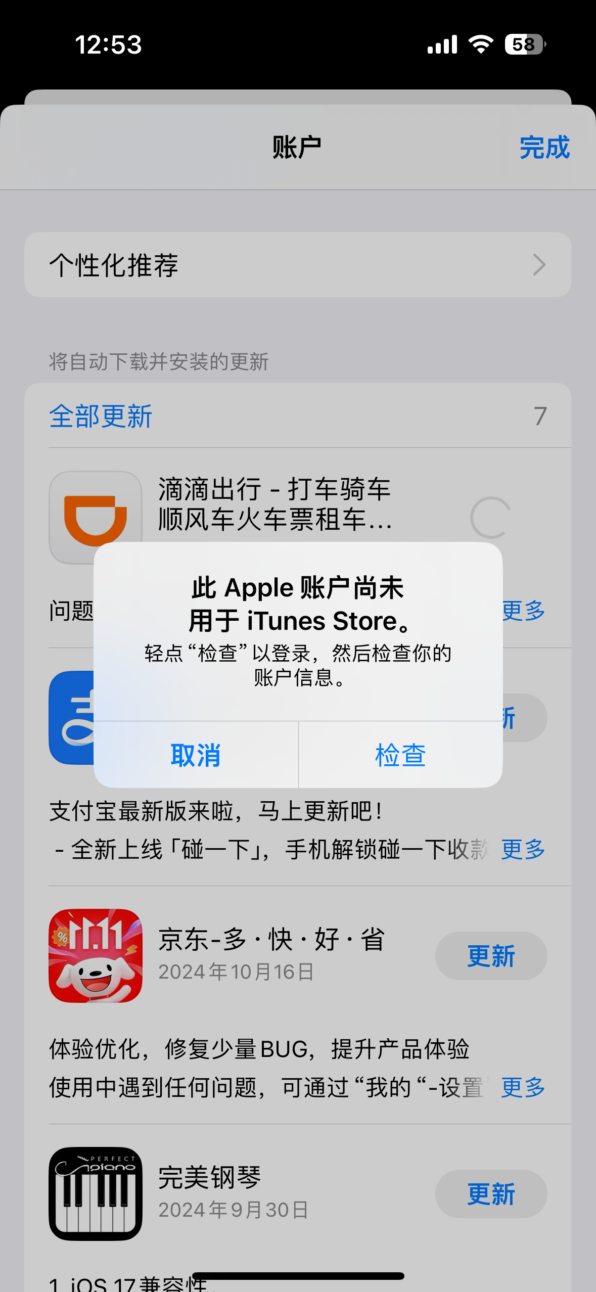 鉴于自己近期在使用新密码,登陆appleid时的旧密码暂时性忘却了。于是我修改密码为新密码。第一个问题出现了:即当我按操作更改完密码后,更新软件要求输入的密码是旧密码(几次试错下得到的结论)。用旧密码输入完后,弹出了“此账户尚未用于iTunesStore”然后要求我检查。有趣的是,早在之前我就已经完成了iTunesStore的账号创建,它竟然还需要我检查,这也是第二个问题。