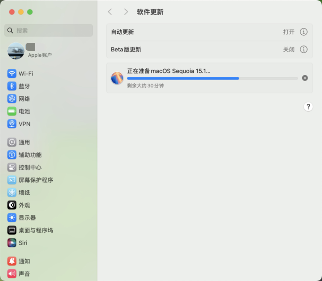 升级macOS sequoia 15.1 报“未能准备软件更新。请重试。 ”