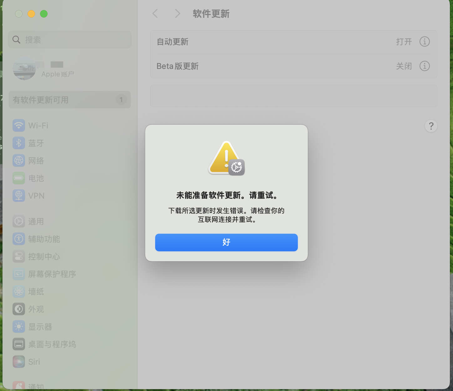 更新下载完成后,过一段时间提示“未能准备软件更新。请重试。”.然后往复循环.