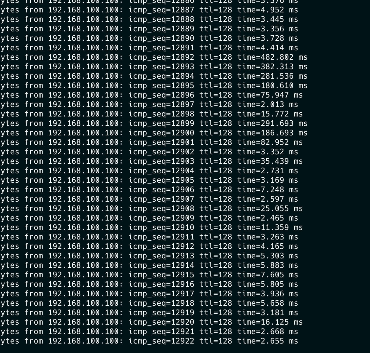 先在Mac上运行命令,iPad在一旁待机。可以观察到,一开始延迟稳定在 ~5ms。此时点亮iPad,延迟骤增至数十甚至数百ms。