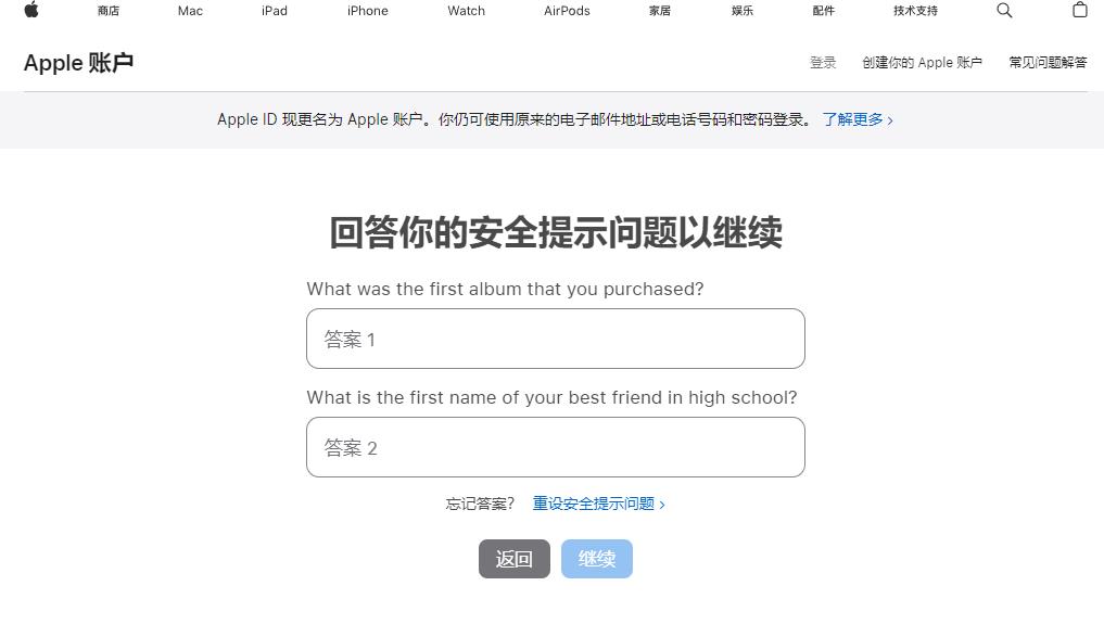 登录美区苹果官网时,我无法登陆,系统提示要求我填写安全问题的答案,但是我不记得这些答案,因为我的iTunes美区账号大约是在2014-2015年注册的