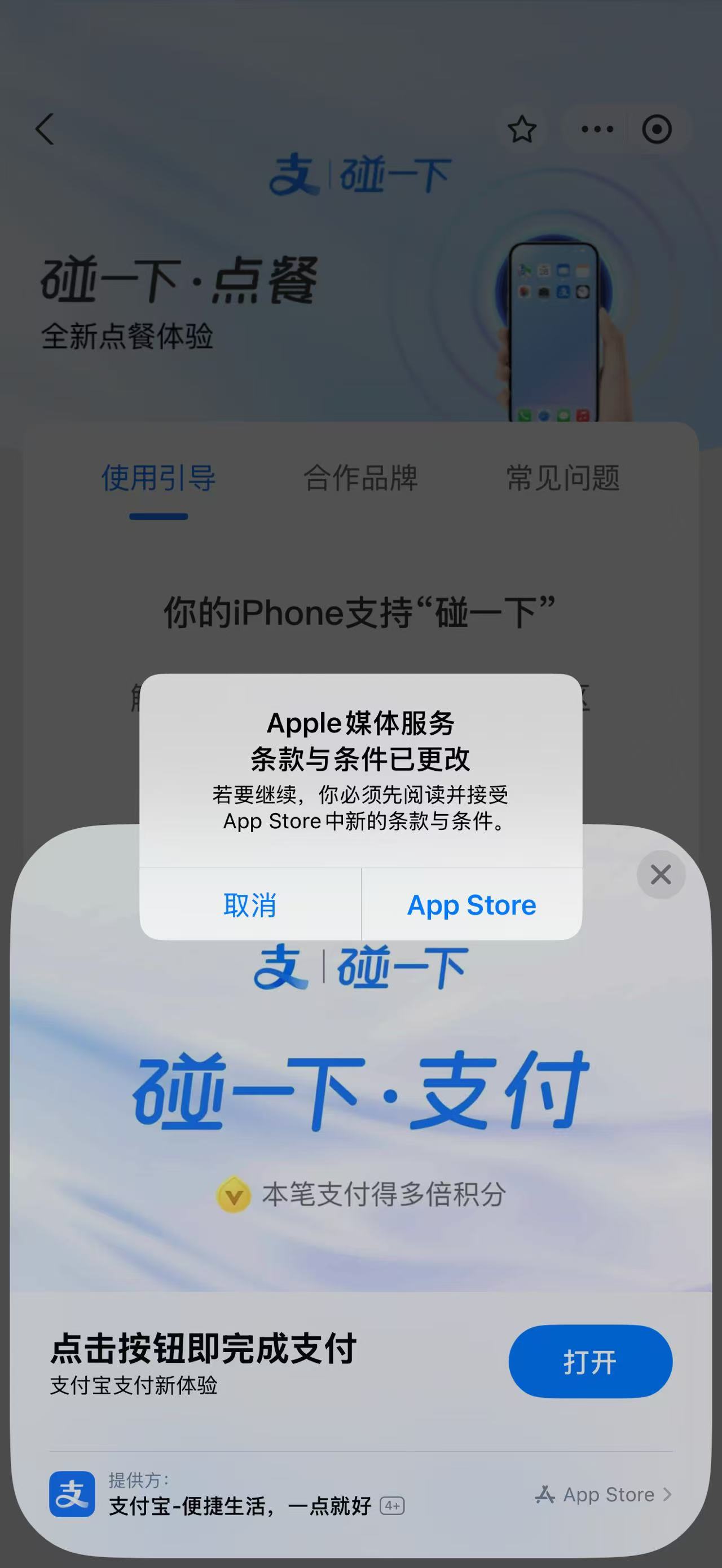 支付宝碰一下支付,16 Pro Max弹窗: Apple媒体服务条款与条件已更改,若要继续,你必须先阅读并接受App Store中新的条款与条件。怎么解决
