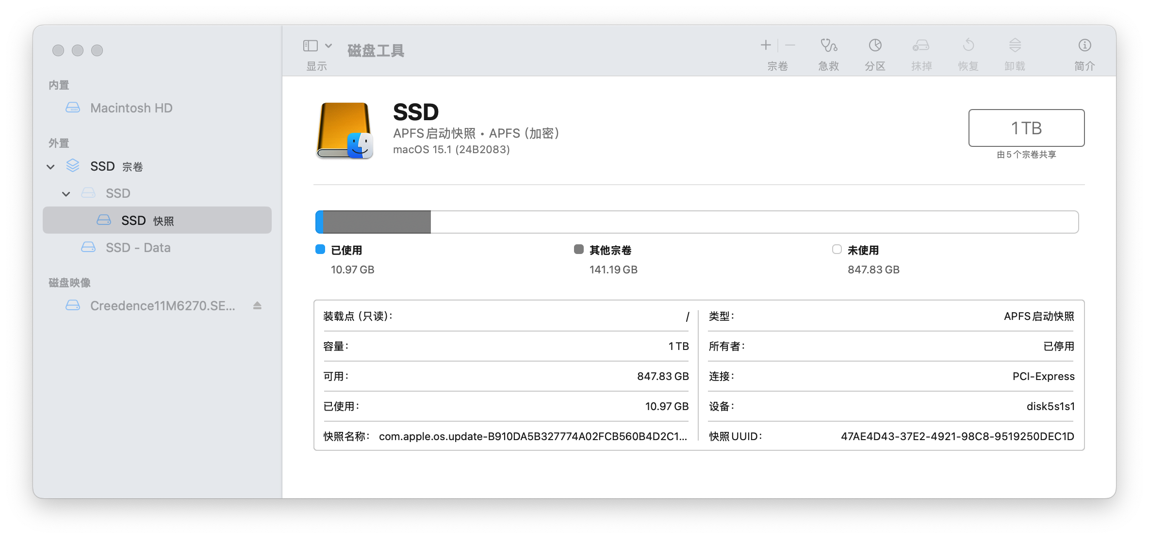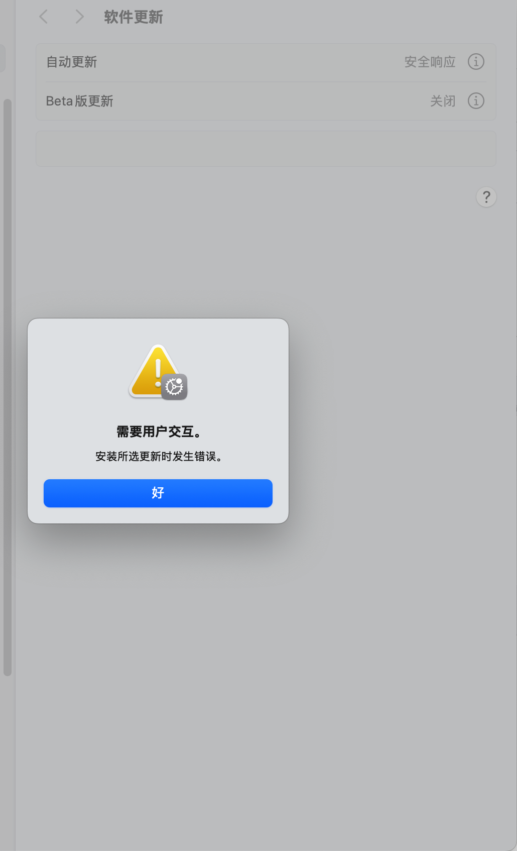 由于内置的256G ssd存储不够使用,我外接了雷电4硬盘盒,并将系统安装在外置硬盘中,然后抹掉了内置的存储,今天收到最新的系统更新后无法正常更新,之前可以通过命令行的方式直接更新,但是今天的系统更新与之前的报错不通,网上没有搜索到相关信息。