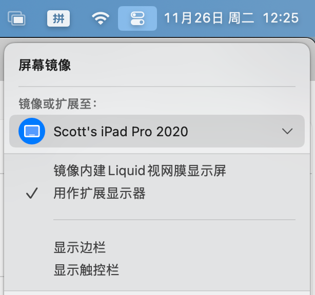 通过“屏幕镜像”,将iPad“用作扩展显示器”。