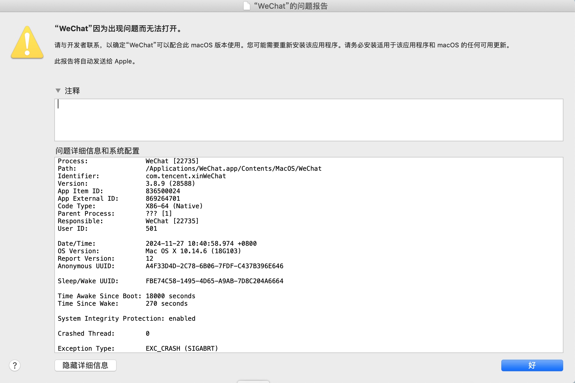 问题被标记为 排名最靠前的回复 以下用户的用户个人资料: justivy justivy 用户级别: 级别 1 8 积分 2024年12月11日 上午5:28 回应 leahzz 遇到同样的问题,都把系统升级了还不行,后来发现可能是 App store 版本的问题,在微信官网下载安装包后安装,覆盖原来版本微信就好了 回复 链接