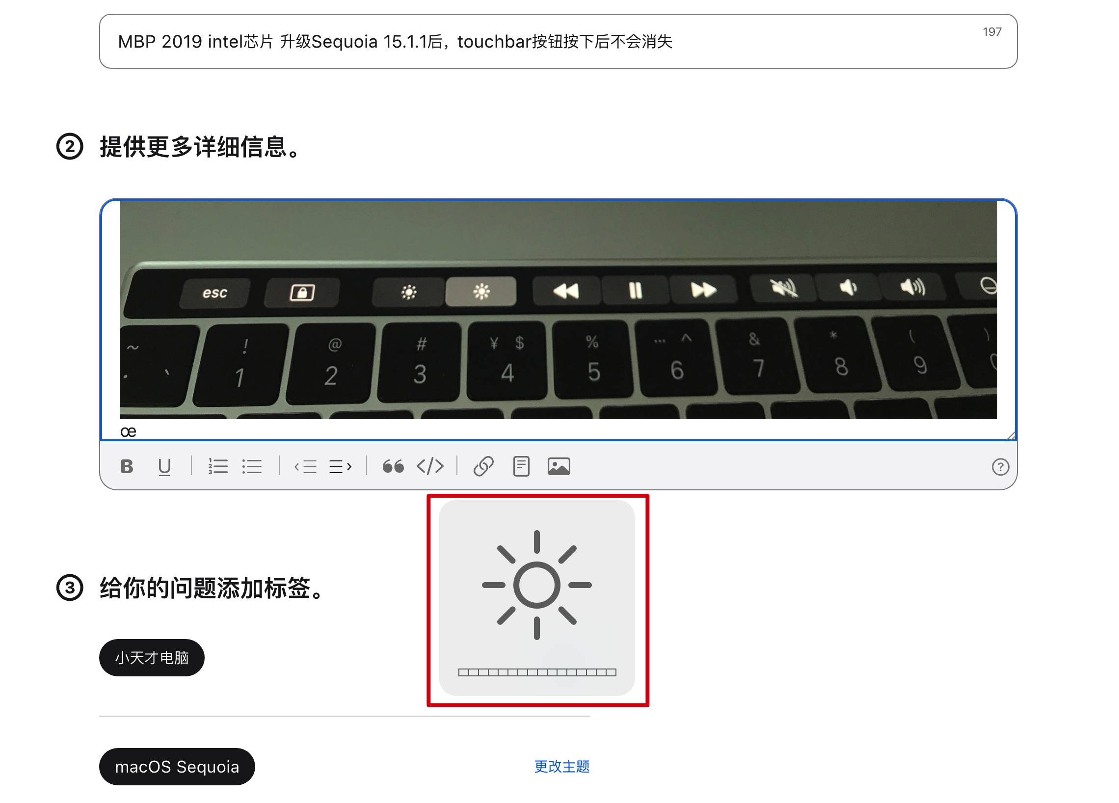 MacBook Pro 2019升级macOS Sequoia 15.1.1后, Touch Bar按钮按下后不会消失