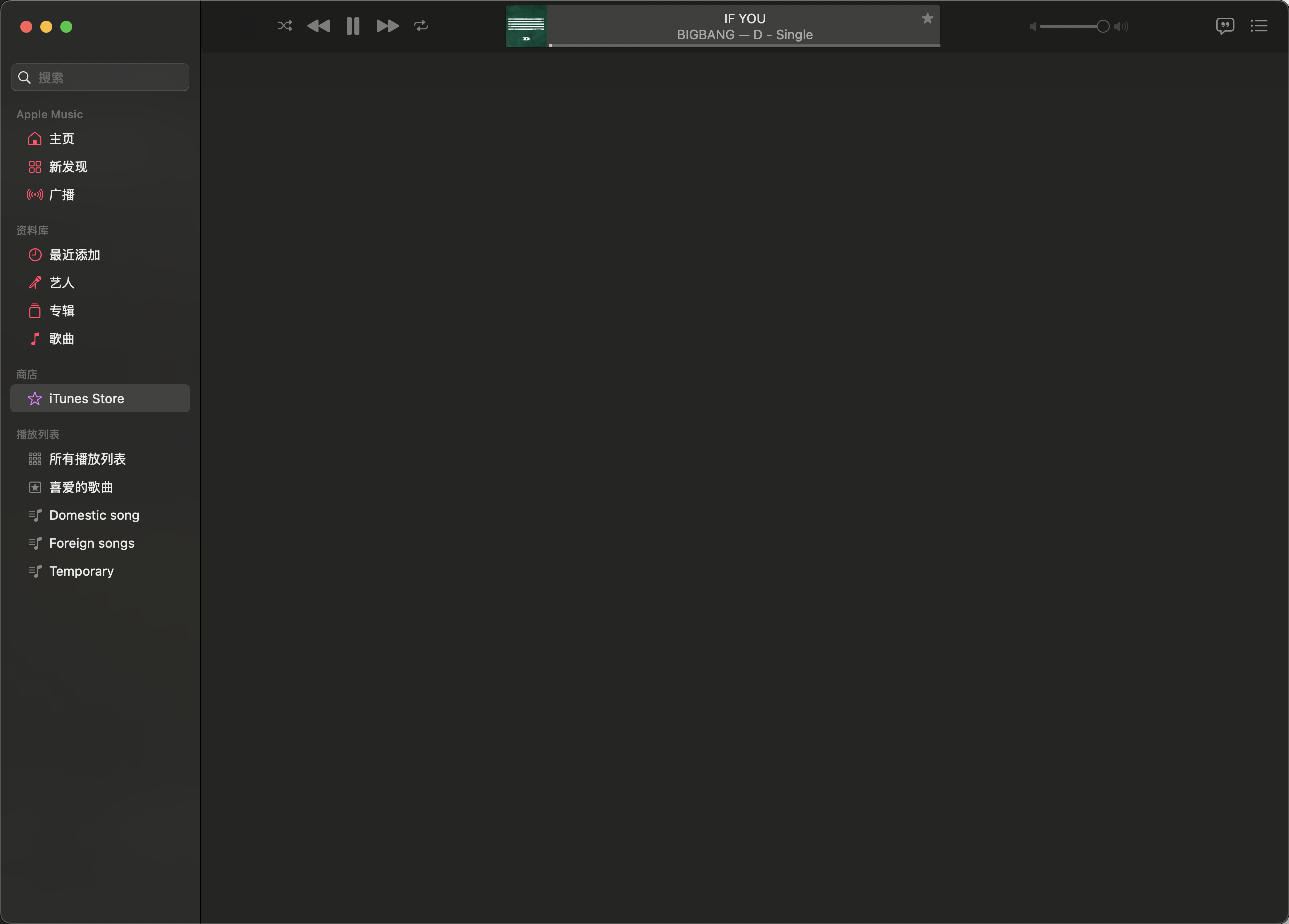 在使用 Apple Music 时会偶发性的出现界面无法切换,无论我点击哪一个左侧标题栏的 tab,它始终会直接切换到 iTunes Store,至少这一次是一直指向 iTunes Store,之前出现的时候我已经记不清是不是也指向 iTunes Store 还是指向别的界面了。