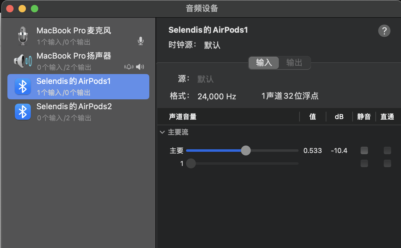 我的AirPods在连接蓝牙之后,打开音频设备中显示为两个蓝牙设备,并且左耳显示为1个输入0个输出且无法更改任何设置,另一个则正常。我尝试过一切将它改为音频输出设备包括重置设备,但完全不起作用。左侧声音始终为单声道不可调整。