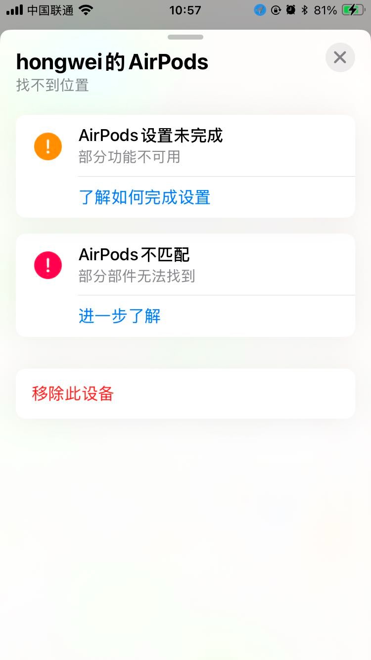 已经尝试了各种各样的办法,包括但不限于账户解绑,恢复出厂设置,但仍然提示“airpods设置未完成(部分功能不可用)”,“AirPods不匹配(部分配件无法找到)”