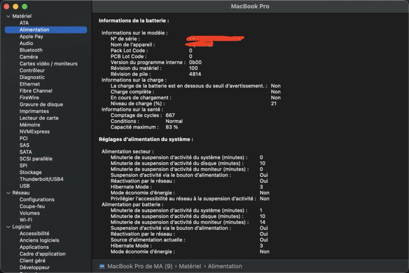 我是2022年2月3日购买的M1Max的macbook pro,电池循环次数是667次,健康度在系统显示中是83%。