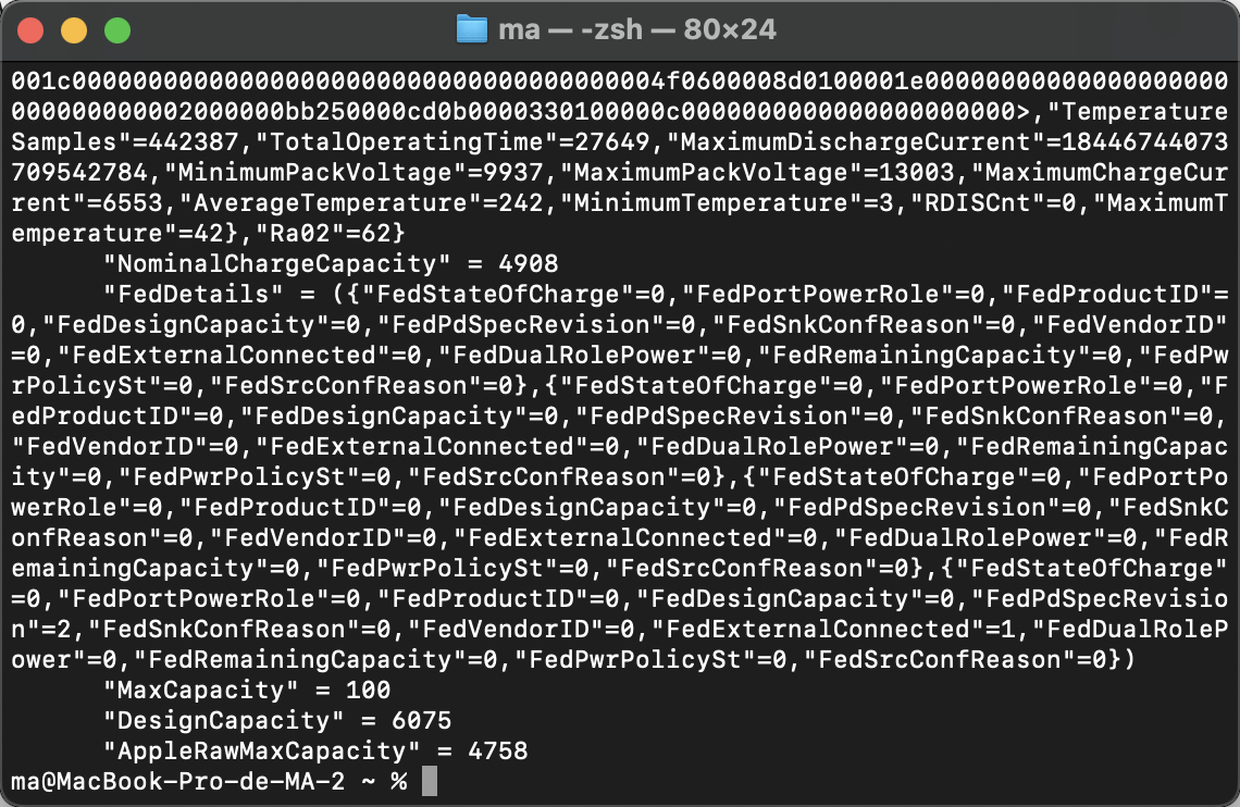 但是在终端上输入ioreg -rn AppleSmartBattery | grep -i capacity,通过计算得出电池容量是78%,不知道应该以哪个为准,我觉得终端上显示的更为实际,系统显示的83这个百分比已经很久很久没有下降了。