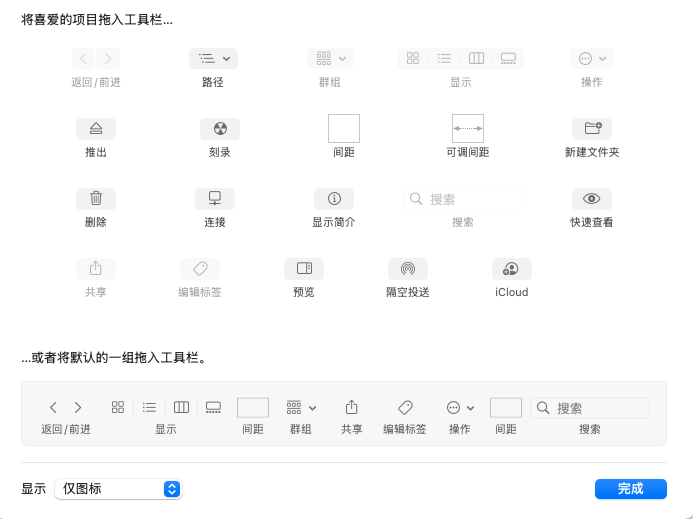 以下用户的用户个人资料: Apple_朱义国 Apple_朱义国 用户级别: 级别 1 8 积分 2025年1月19日 上午12:56 回应 Ryorrr 打开访达后,鼠标放置右上角工具栏处,右键选择自定义工具栏。打开新的窗口鼠标放置这个位置,右键选择使用默认组,点击完成即可 回复 链接