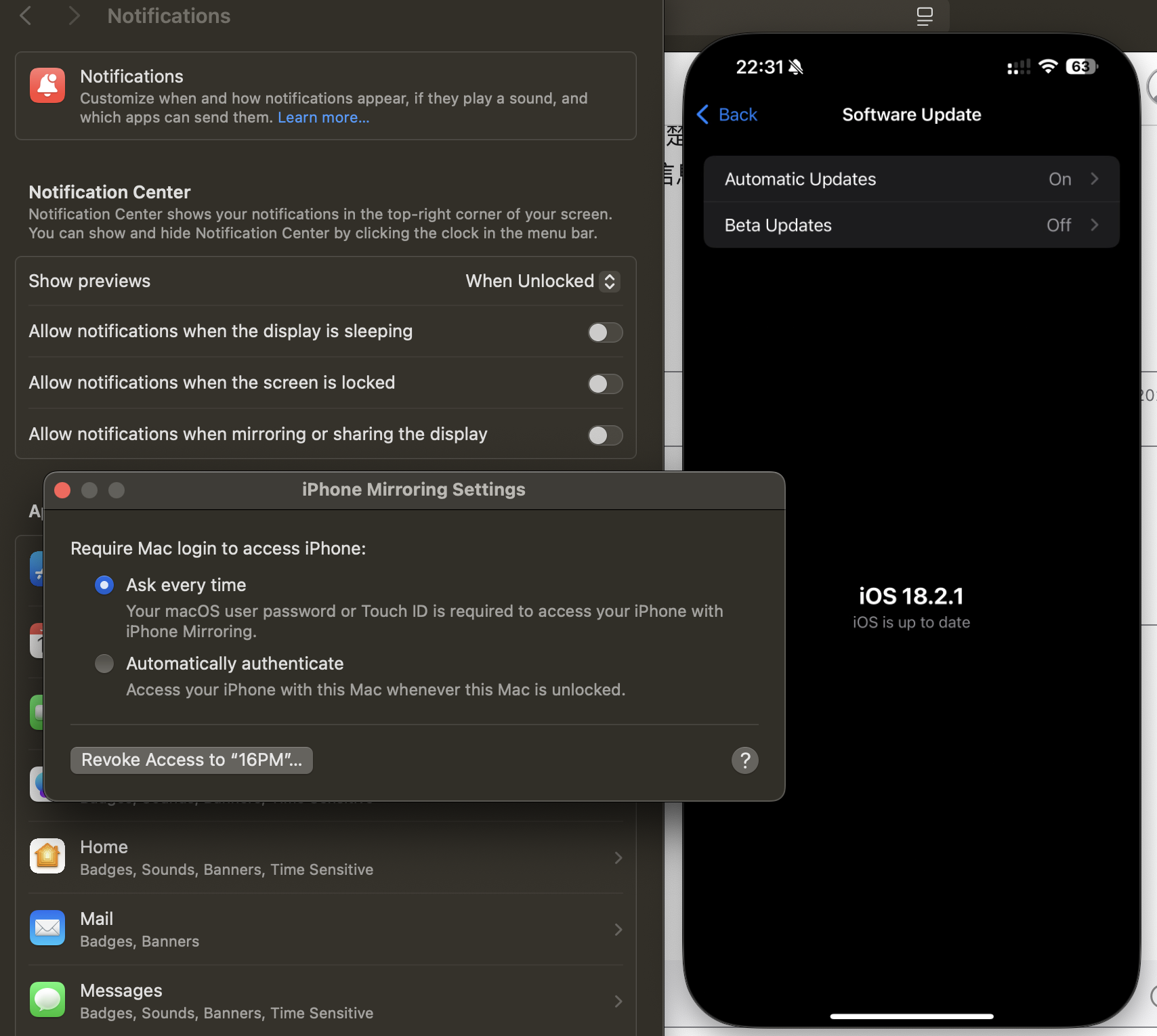 MacBook无法接收已镜像iPhone的通知(macOS 15.2 + iOS 18.2.1)