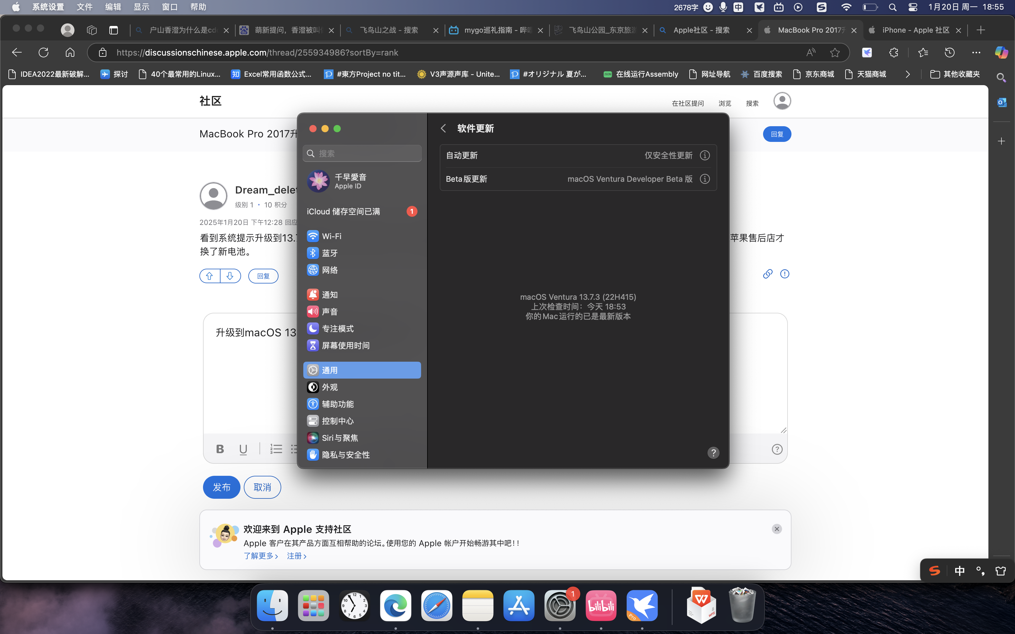 这台MBP2017电池健康正常,之前是macOS 11,现在升级到13就出现了异常关机的现象。