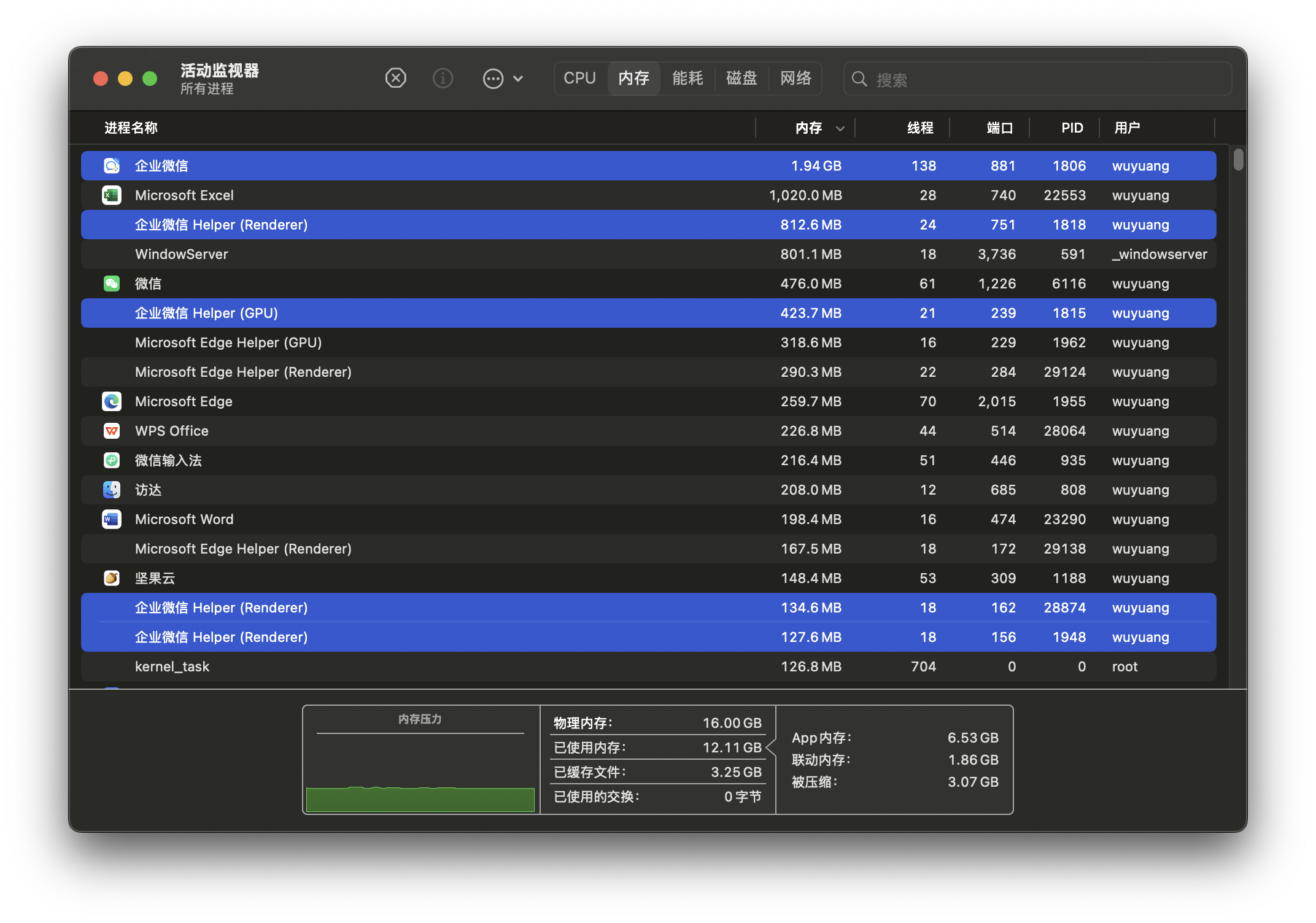 企业微信放在这里没干什么,内存就特别大, Excel 文件更是逆天,wps 或者 Microsoft 的的 Excel 文件在 Sequoia 上能把这些最新的处理器都干卡,但金山的工程师排查是 Sequoia 问题,确实我发现之前 Sonoma 的时候没见到这么多问题