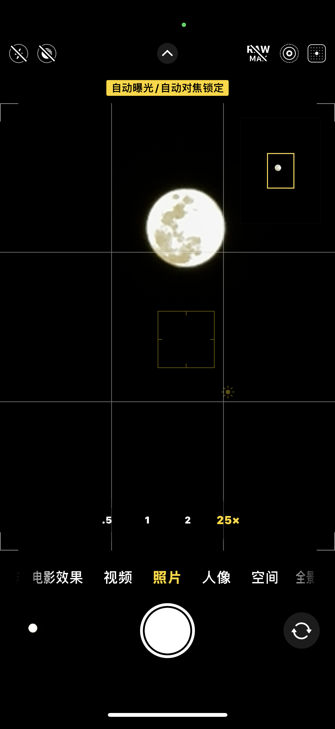 相机长焦难以聚焦清晰,当以25x拍设月亮时,看到的和拍到的完全不同,拍到的是一个大大的白圆盘,毫无细节。上图是相机屏幕上看到的,下图是相机拍到的。