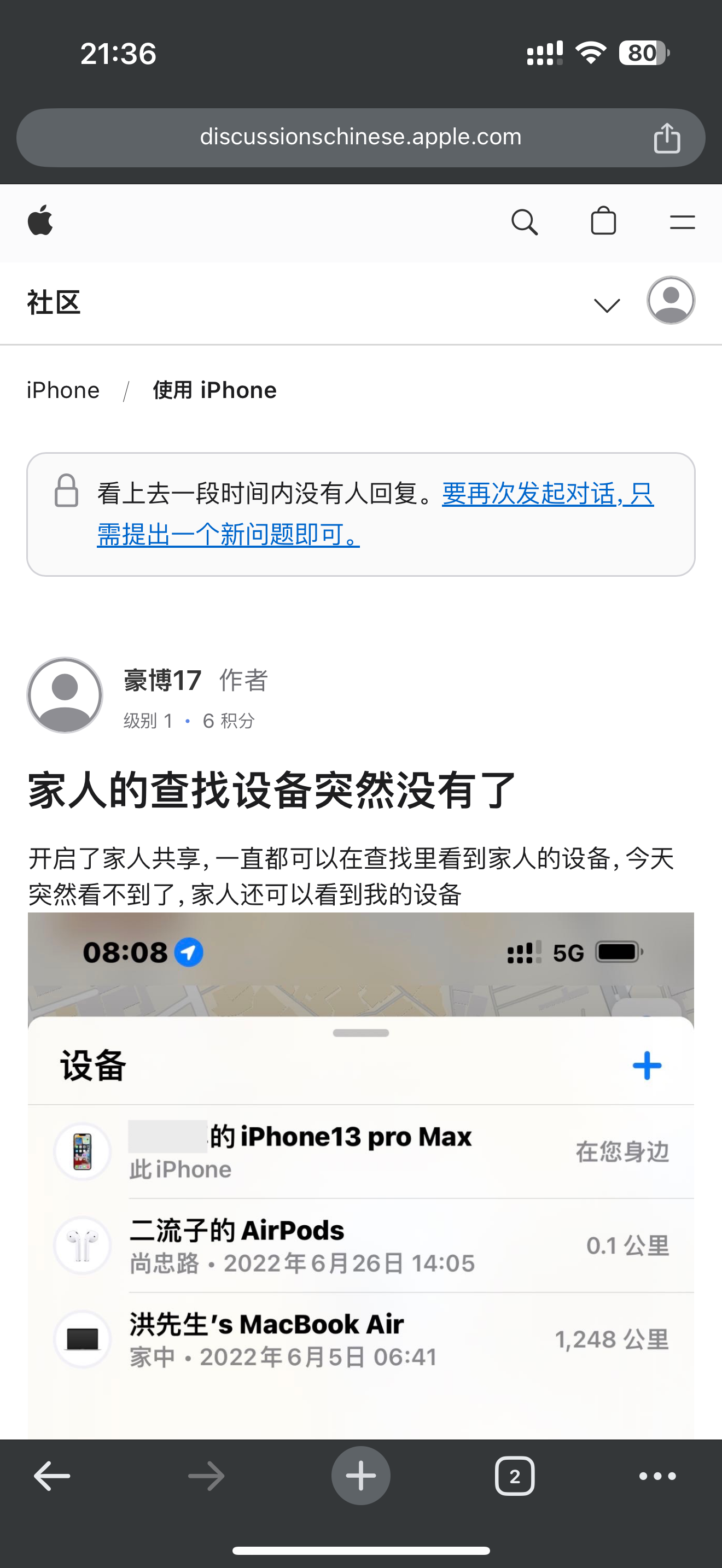 我搜索到社群有好多伙伴有同样的问题家人的查找设备突然没有了 - Apple 社区,但是没有得到解决。