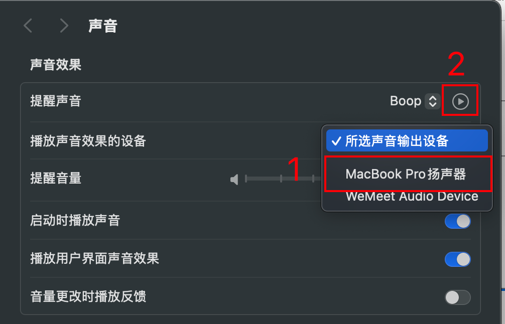 切换播放声音效果的设备到 “MacBook Pro 扬声器”, 点击提醒声音播放试听。之后就有提示声了,后面可以再切换回 “所选声音输出设备”。