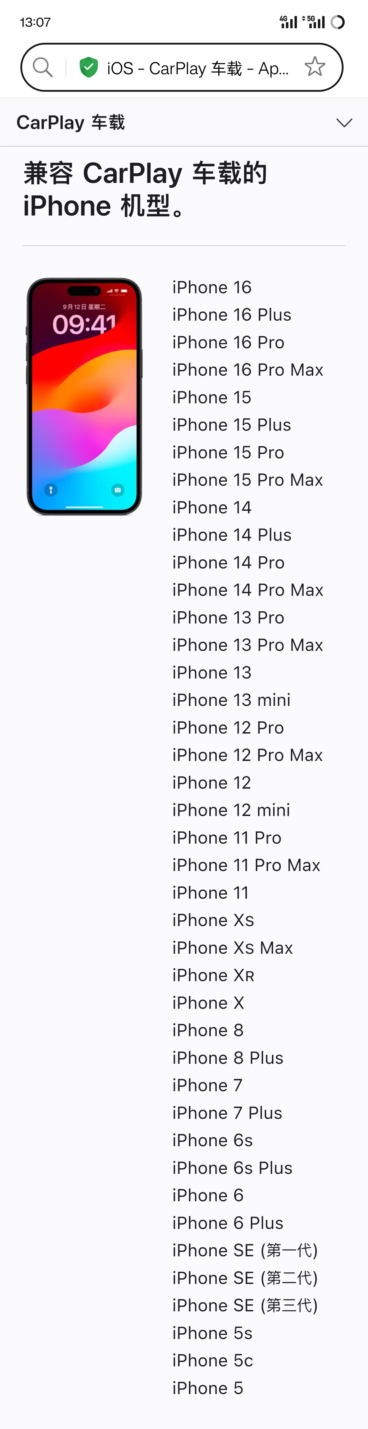 我在 Apple 官网上查看到兼容 CarPlay 车载的 iPhone 机型里没有 iPhone 16e,但不知道这是不支持 iPhone 16e,还是还未写入到兼容机型列表?毕竟 iPhone SE 第一代、第二代、第三代都支持 CarPlay 车载。