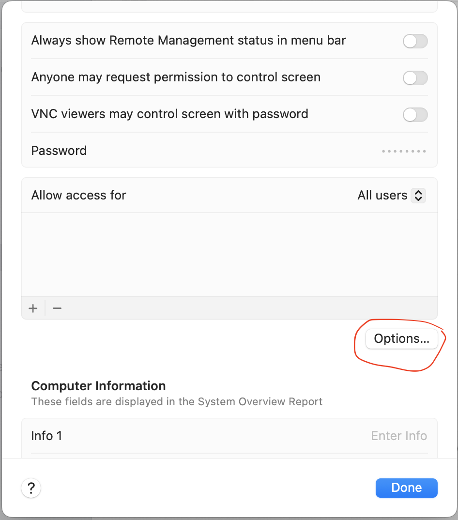 ✅ 远程管理打开状态、允许所有用户访问、vnc可以使用密码控制屏幕且已设置密码