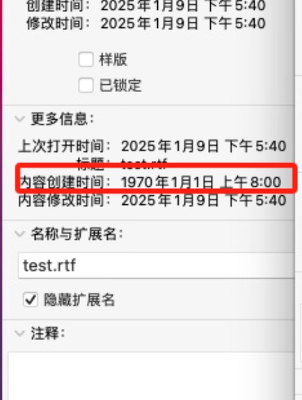 mac os 10.15 11版本,使用nas存储,smb协议,上传文件到存储后,右键显示简介显示创建时间为1970年