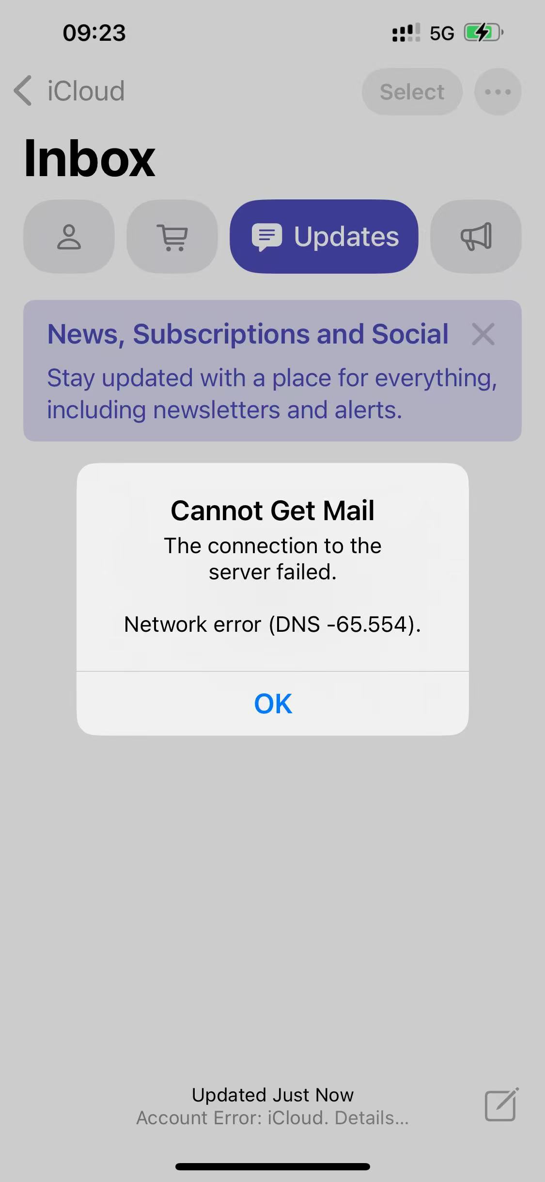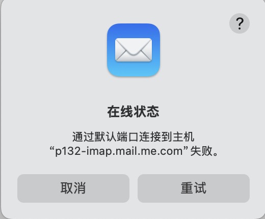 icloud邮箱自昨日起无法使用。同一账户下,Iphone端icloud邮件显示‘Network error(DNS - 65.554)’. MAC端icloud邮件显示‘通过默认端口连接到主机“p132-imap.mail.me.com”失败’,Mail里的谷歌邮箱正常接收邮件,网页端icloud可以接受邮件但无法访问。