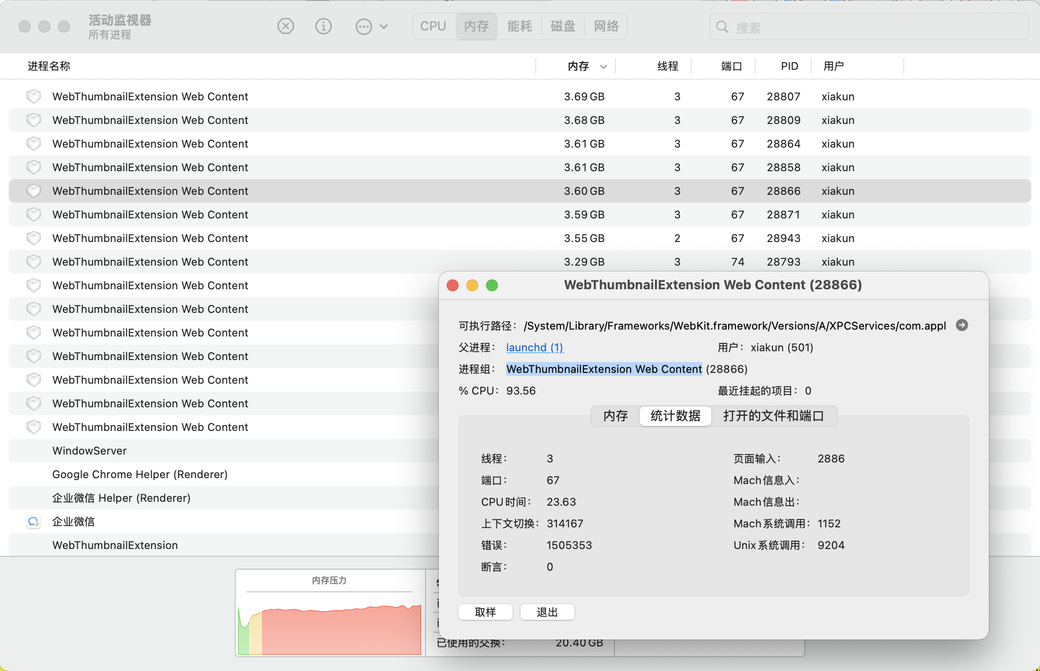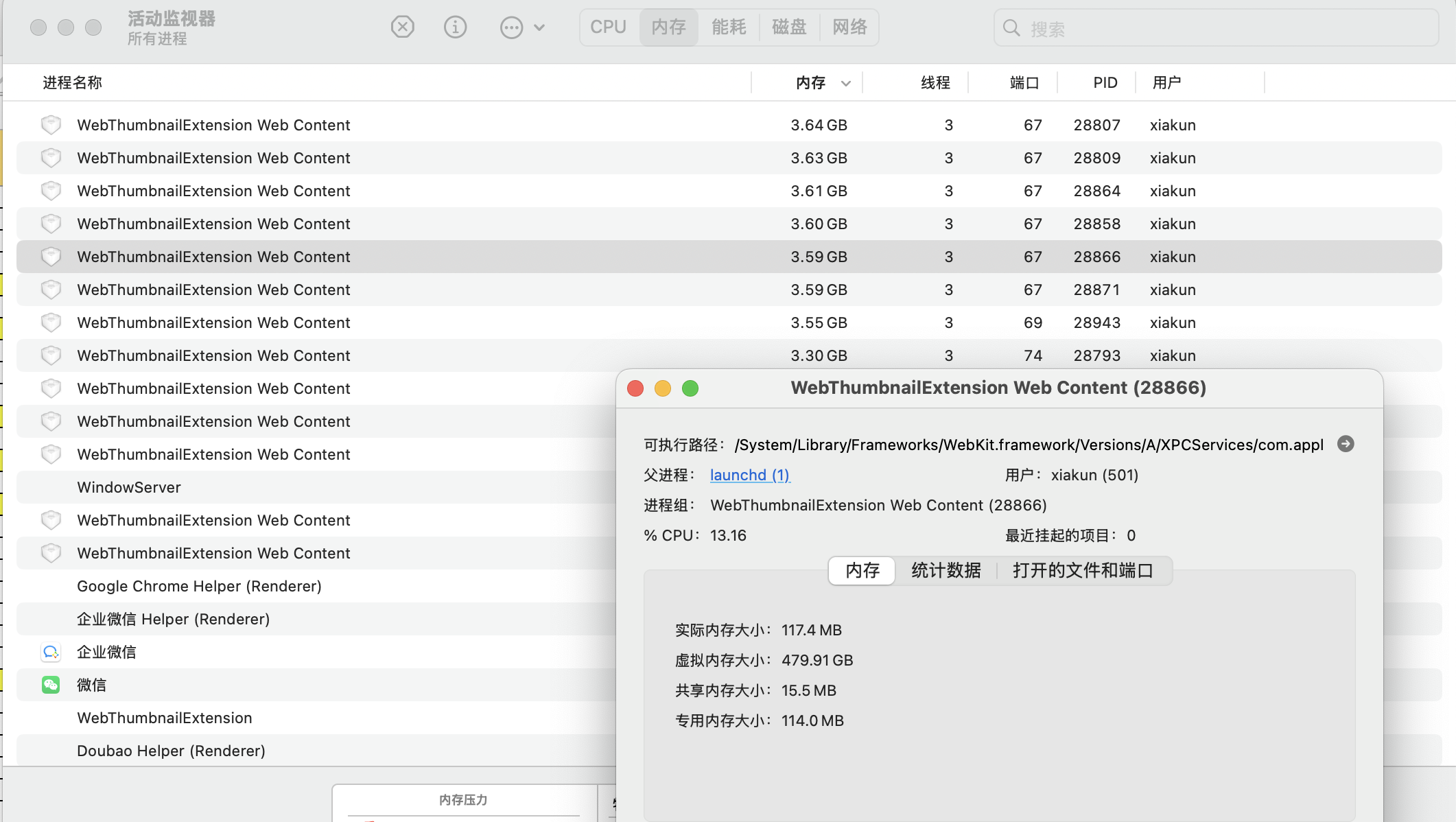 打开活动监视器观察,出现大量WebThumbnailExtension Web Content进程,每个都占用很多内存