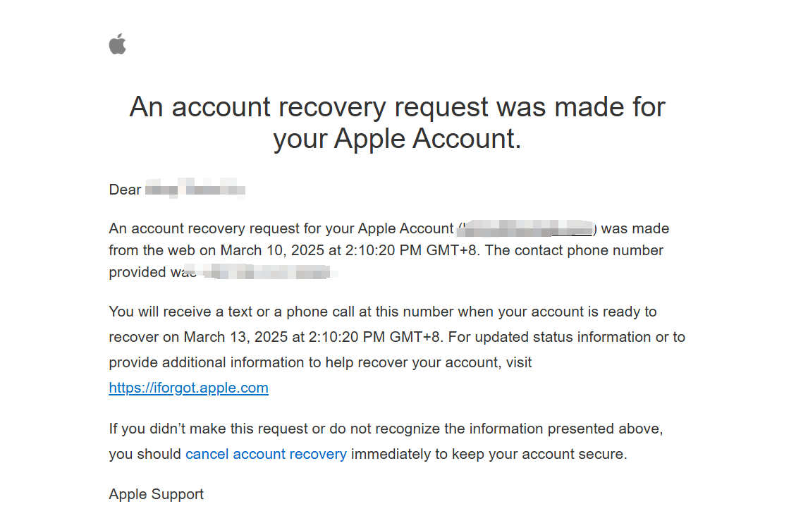 开启Apple账号恢复,等待期过后未接到短信或来电