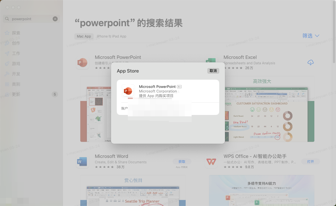 Mac 上的 App Store 点击安装弹出窗口,只有取消按钮