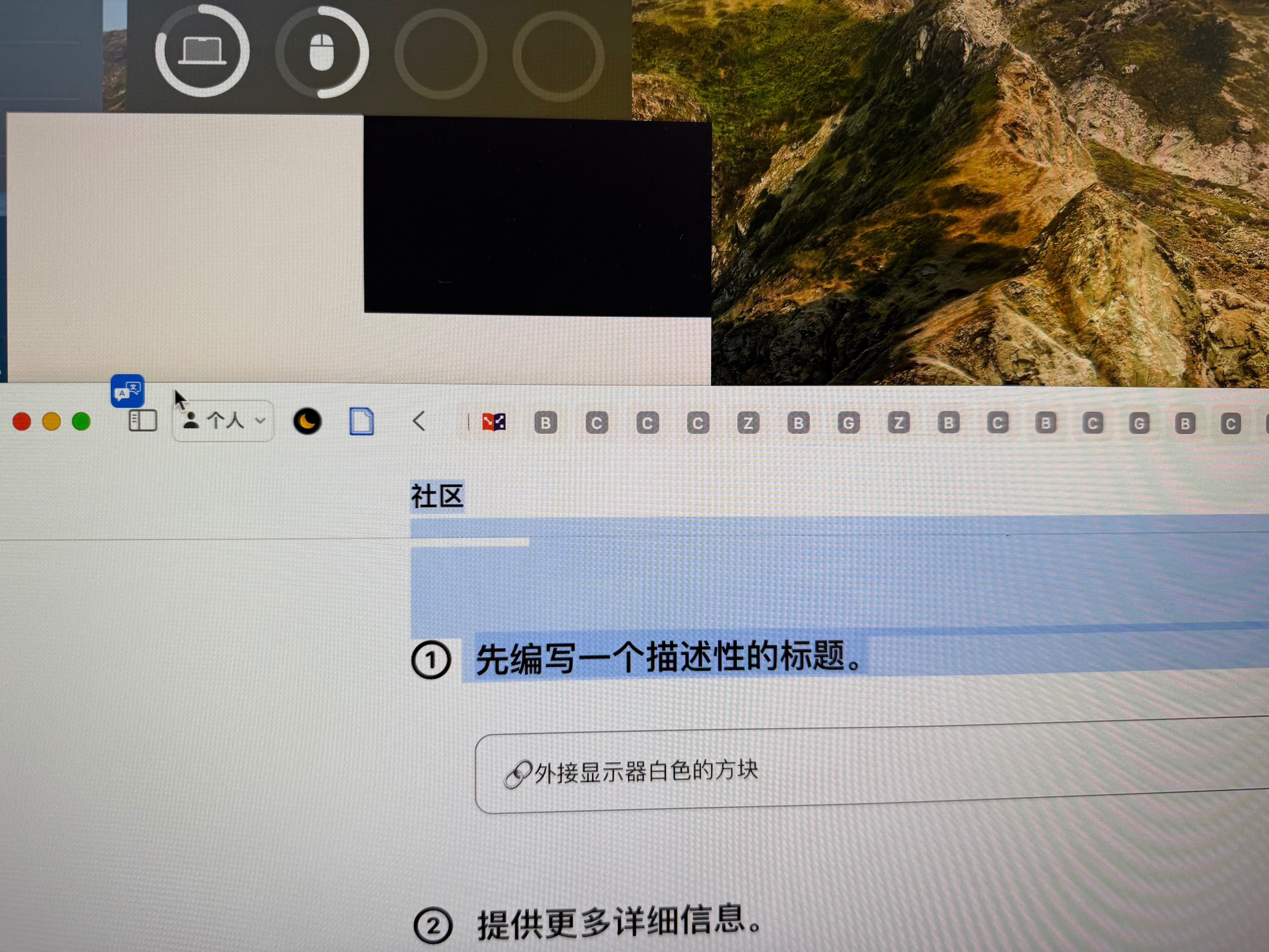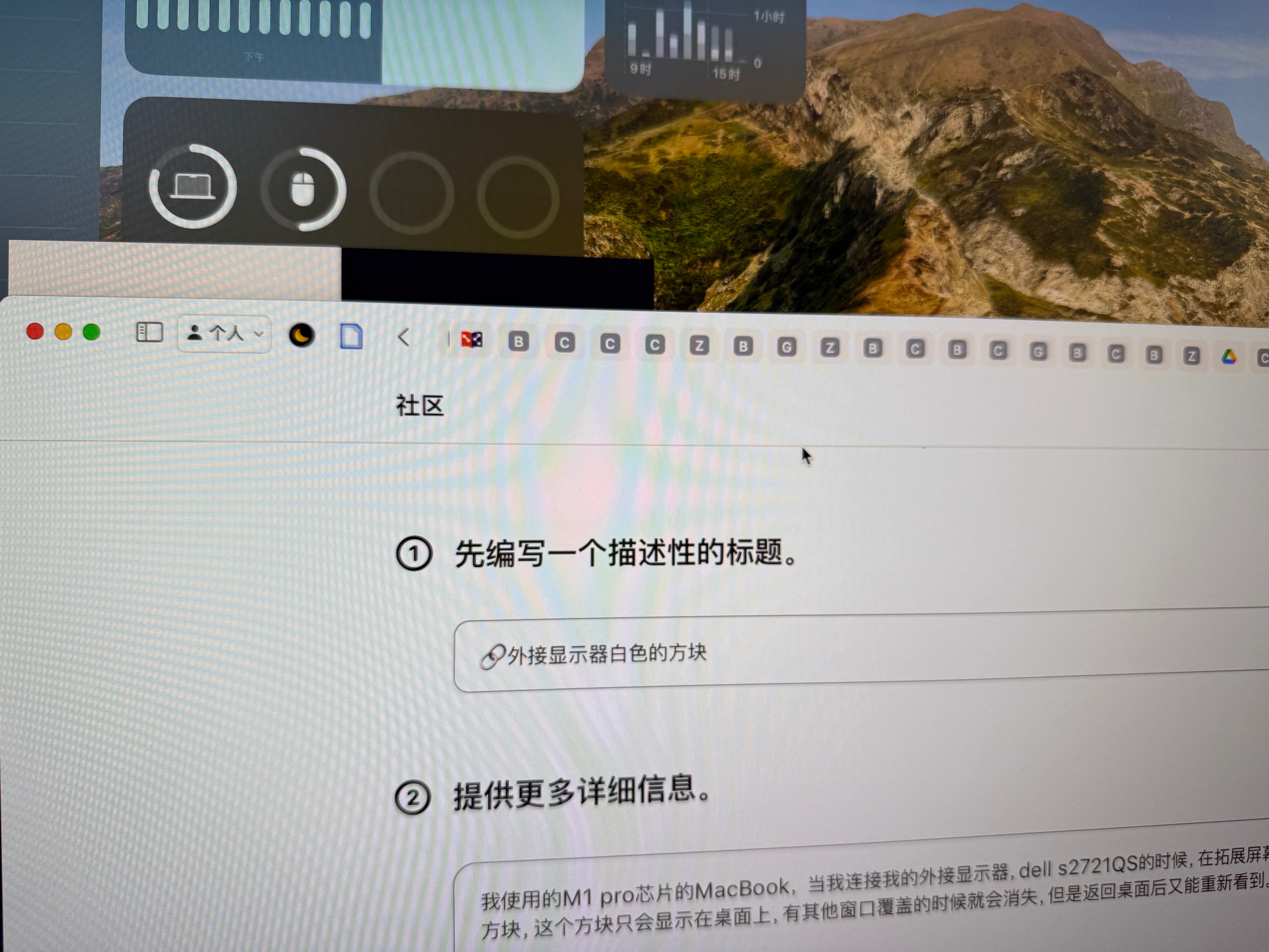 我使用的M1 pro芯片的MacBook, 当我连接我的外接显示器,dell s2721QS的时候,在拓展屏幕的桌面上会出现一个白色的方块,这个方块只会显示在桌面上,有其他窗口覆盖的时候就会被遮挡住,但是返回桌面后又能重新看到。这个问题之前出现过三四次了,每次重启后都会好一段时间,然后又突然出现,想问一下具体的原因以及解决方法。