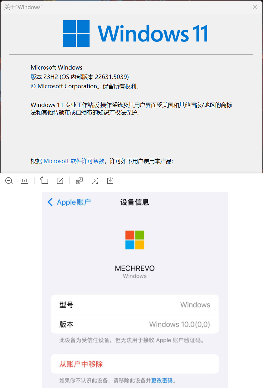 Apple账户登录的设备信息与win设备信息不一致,电脑win上实际是11,Apple账户显示win10.