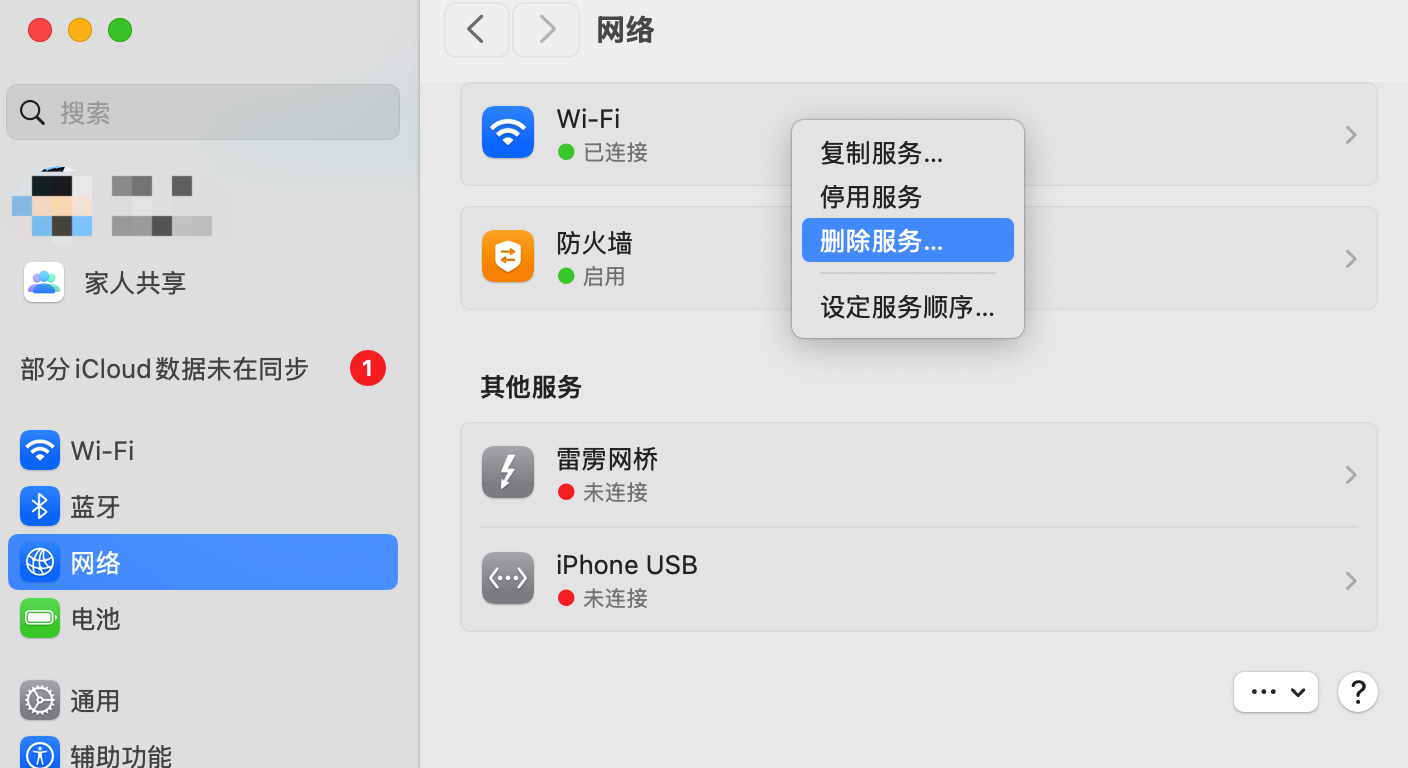 解决方法:通过删除“设置”-“网络”,在“WiFi”选项右键菜单中选择“删除服务”,再重新添加“WiFi”服务,MacBook Pro网络恢复正常。为什么会出现这种情况?有没有可以一次性解决的方法?